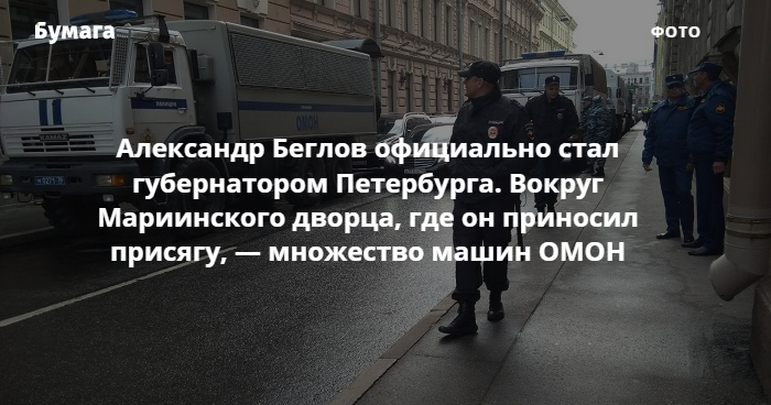 Утром 18 сентября Александр Беглов принес присягу в Мариинском дворце и официально стал губернатором Петербурга. Здание охраняло множество машин ОМОН и полиция, отметили очевидцы.