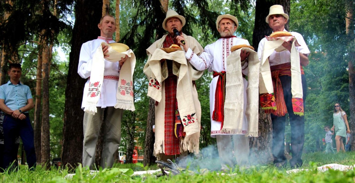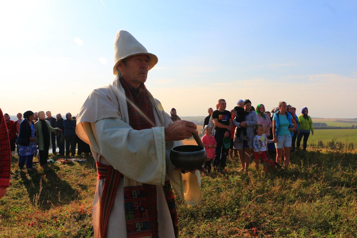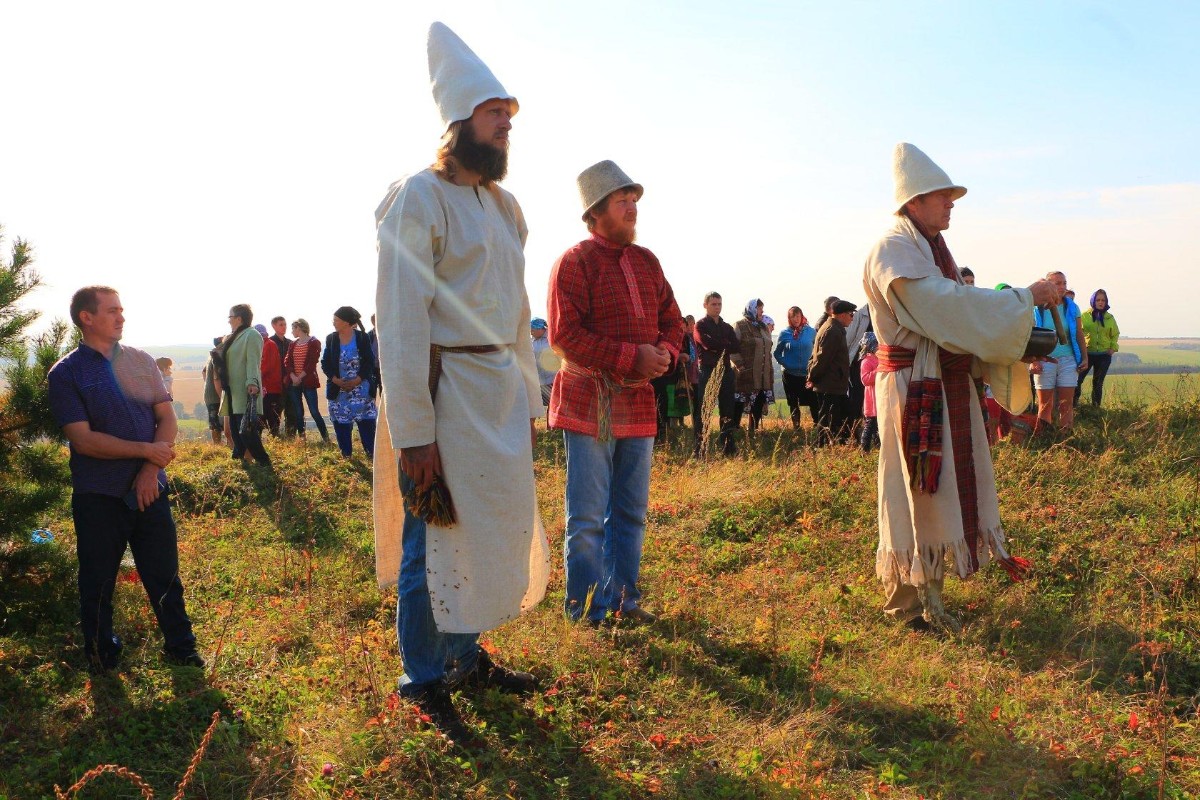 Около 50 человек, даже самые пожилые кузюмовцы, забираются на пологую гору Четкер. Под ногами — дикая земляника, колючки цепляются к одежде. Впереди идет Андрей Перевозчиков, теперь на нем белая одежда и высокий войлочный колпак, рядом с ним, тоже в национальной одежде и колпаке, верховный жрец Удмуртии Николай Михайлов.