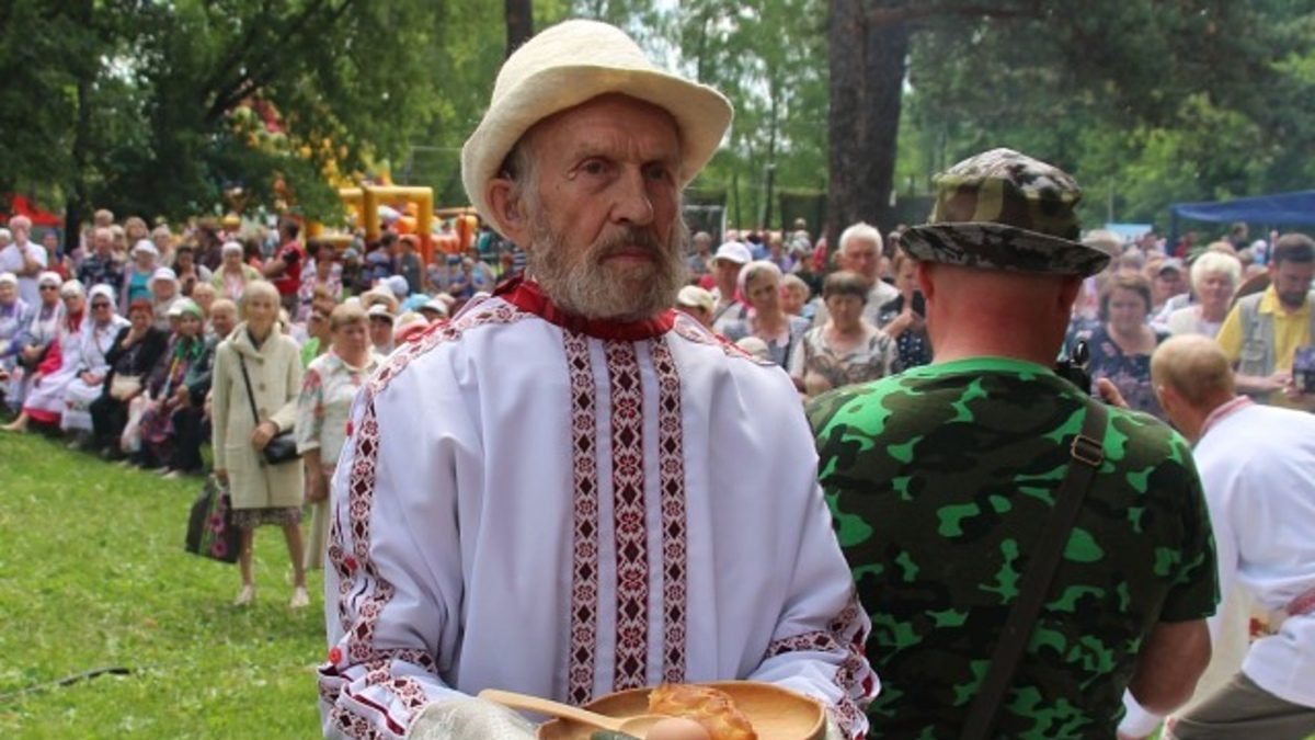 Собравшиеся в основном пожилые люди. Большая часть женщин — в национальных удмуртских платьях и атласных фартуках ярких цветов. Все стоят полукругом вокруг маленького низкого столика. На нем белая скатерть с четырьмя яблоками по углам — чтобы не унесло ветром. Сегодня он очень сильный. На скатерти стоит портрет мужчины с белой бородой и седыми волосами, отредактированный в фотошопе так, как будто он на голубоватом фоне летает в облаках. Слева от портрета надпись: «И если завтра мой язык исчезнет, то я сегодня умереть готов».