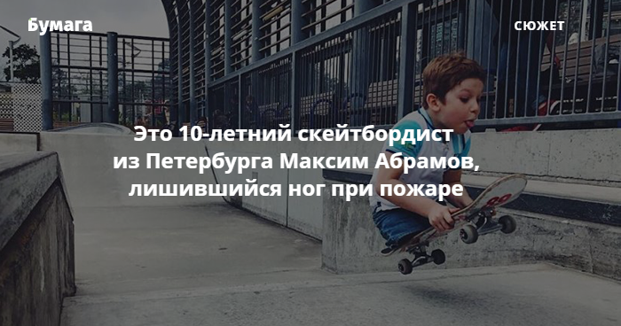 В сентябре один из самых известных скейтбордистов в мире Тони Хоук опубликовал в инстаграме видео с 10-летним Максимом Абрамовым, который лишился ног в результате пожара. Мальчик родился в Амурской области, но после реабилитации его усыновила семья из Петербурга. С семи лет Максим занимается скейтбордингом и мечтает выступить на Паралимпиаде.