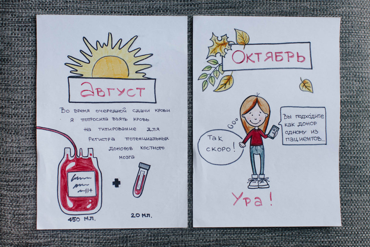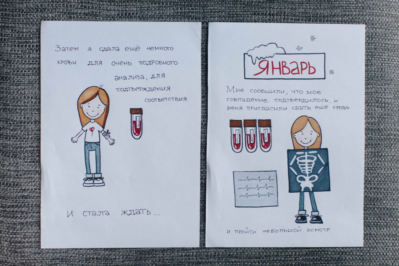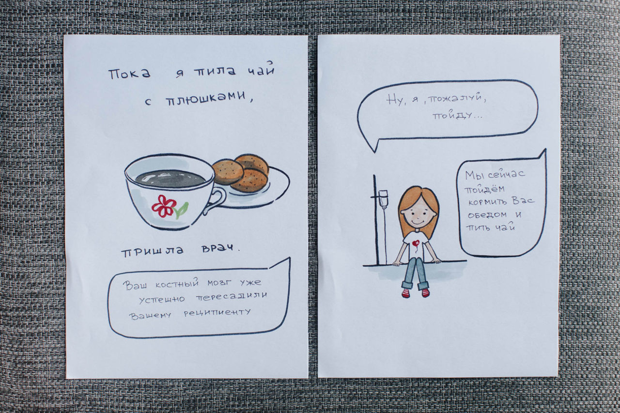 Ольга и Владлена Вопрос «Готовы ли вы встретиться с реципиентом?» Ольга услышала в кино — звонок отвлек от фильма Тарантино и мыслей о том, что написать в следующем посте. Поначалу перед встречей не волновалась, а затем всего за два дня нарисовала целый комикс о том, как стала донором костного мозга.