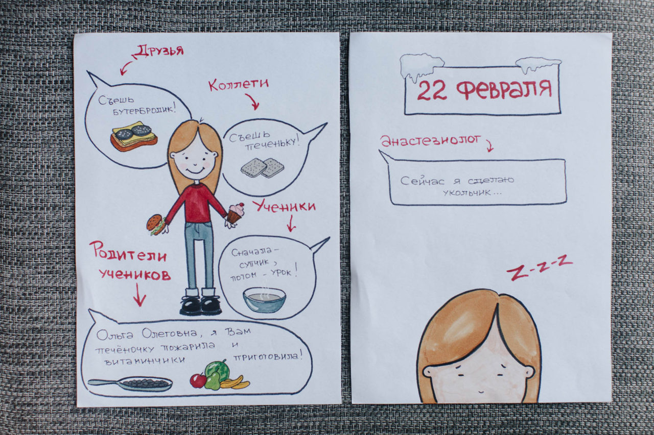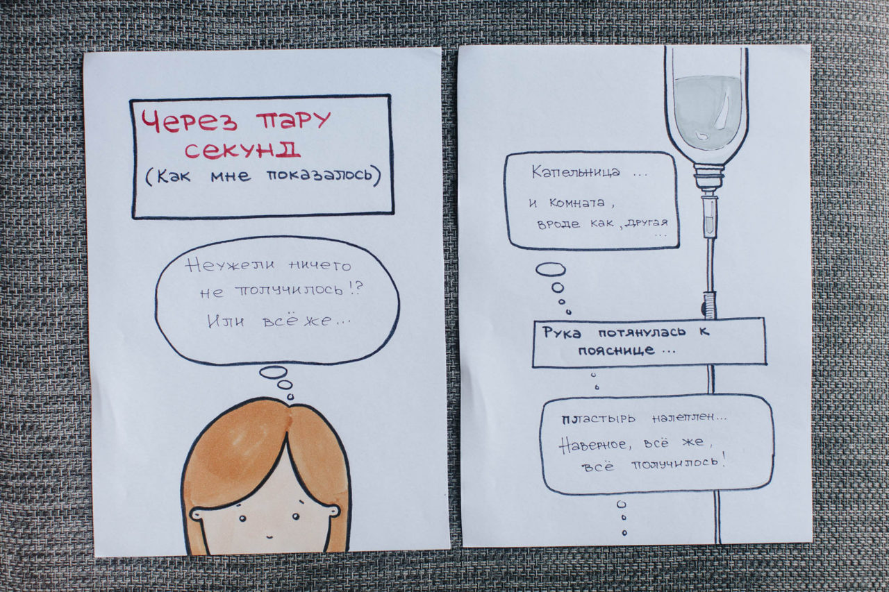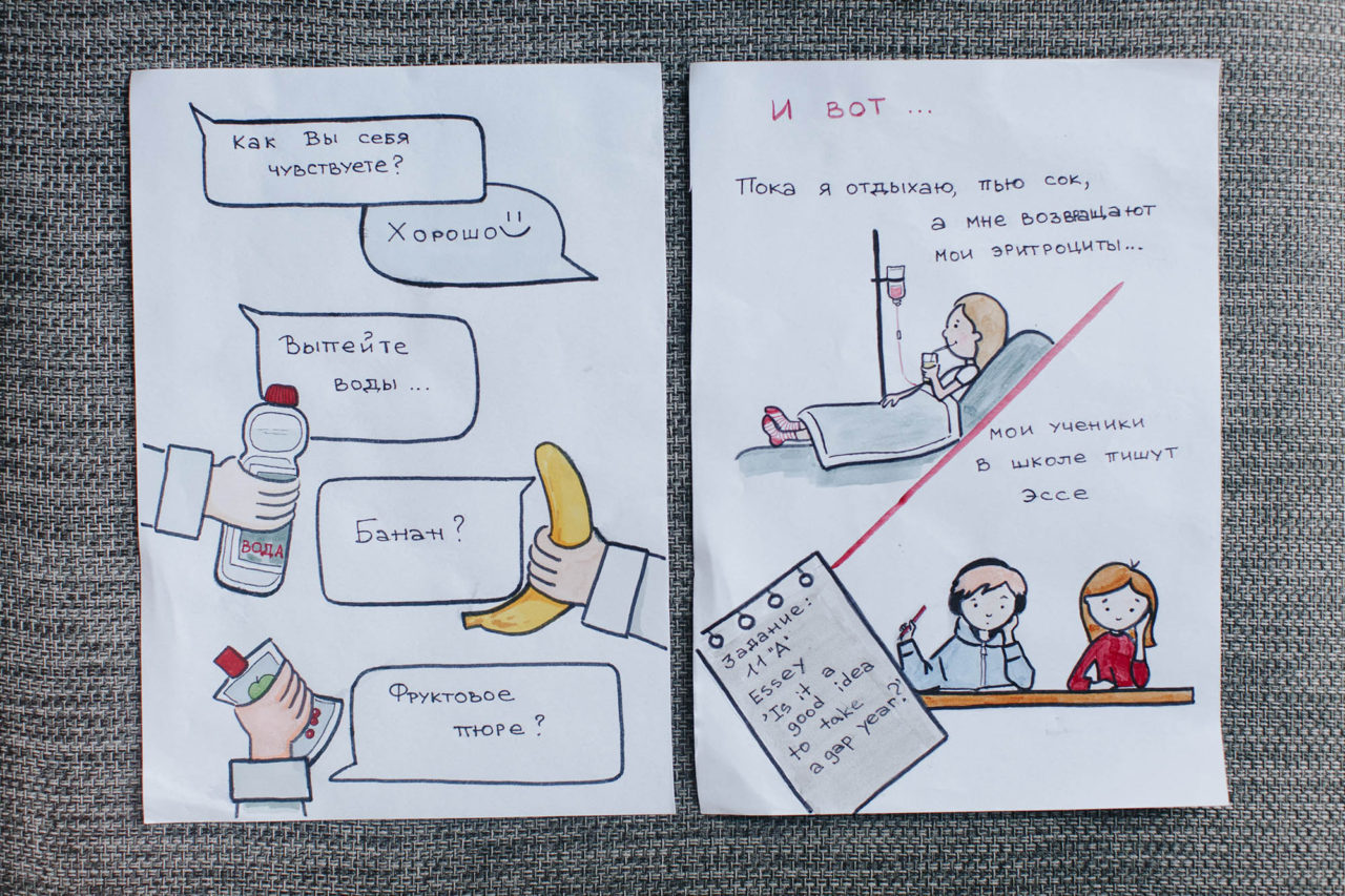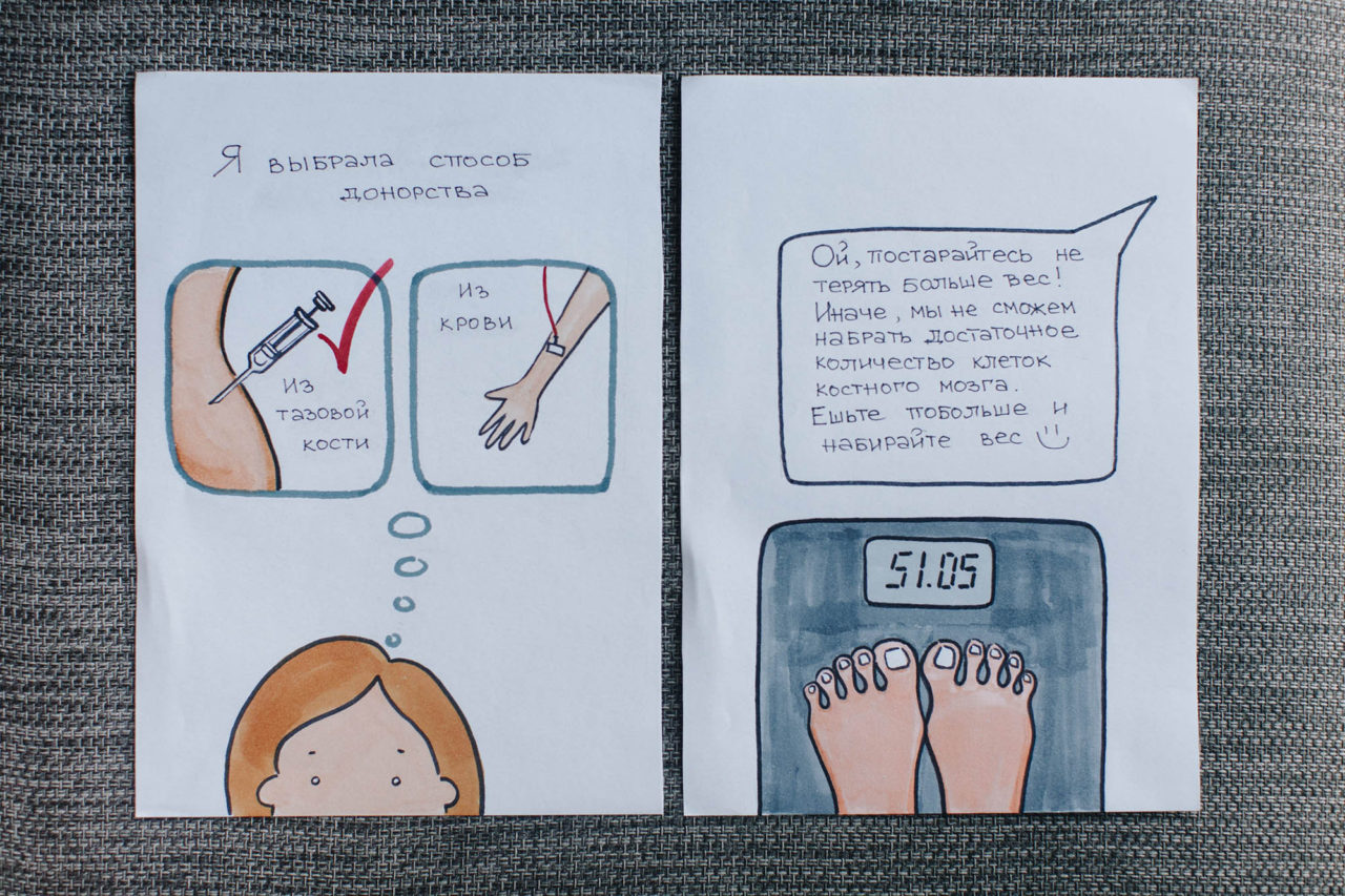 Ольга и Владлена Вопрос «Готовы ли вы встретиться с реципиентом?» Ольга услышала в кино — звонок отвлек от фильма Тарантино и мыслей о том, что написать в следующем посте. Поначалу перед встречей не волновалась, а затем всего за два дня нарисовала целый комикс о том, как стала донором костного мозга.