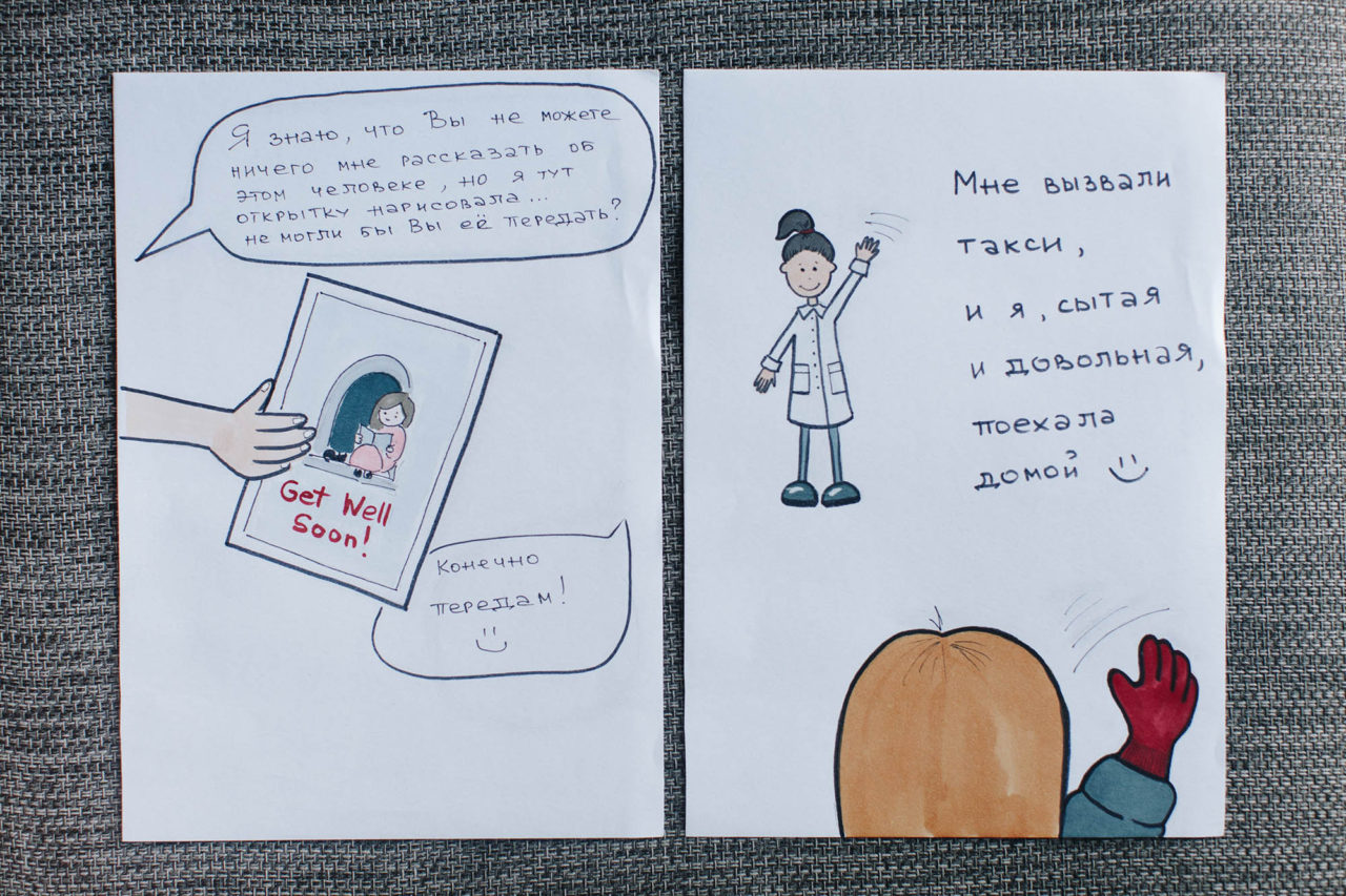 О своем доноре Владлена знала только то, что это молодая женщина. Владлена очень хотела найти ее, искала среди примерно 20 тысяч подписчиков паблика AdVita — все равно что иголку в стоге сена. Еще однажды Владлене передали открытку с трогательным рисунком и пожеланием «Поправляйся!». Но на ней не было ни имени, ни обратного адреса: прежде чем донору и реципиенту разрешат познакомиться лично, должно пройти больше двух лет — только тогда врачи могут с уверенностью сказать, что все основные опасности и самые страшные осложнения позади.