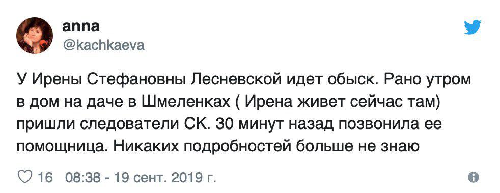 - «У Ирены Стефановны Лесневской идет обыск. Рано утром в дом на даче в Шмеленках — Ирена живет сейчас там — пришли следователи СК», — цитируют «Ведомости» твит Качкаевой, который она удалила спустя полчаса после публикации.