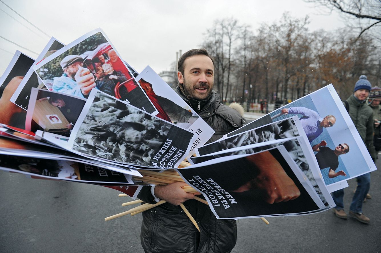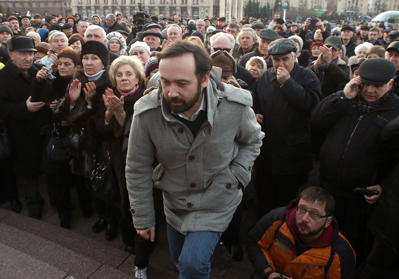 Декабрь 2011 года, Илья Пономарев на проспекте Сахарова в Москве. С белой ленточкой на груди дает комментарий тележурналистам о том, что у председателя правительства Владимира Путина на ближайших президентских выборах нет никаких шансов избежать второго тура и что после первого тура оппозиция объединится вокруг единого кандидата, чтобы составить Путину конкуренцию.