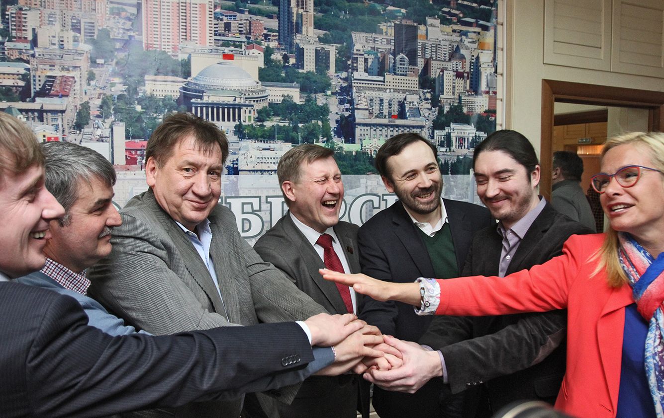Кирилл Кухмарь / Коммерсантъ Кандидаты в мэры Новосибирска. Анатолий Локоть в центре, Илья Пономарев — третий справа. 28 марта 2014 года