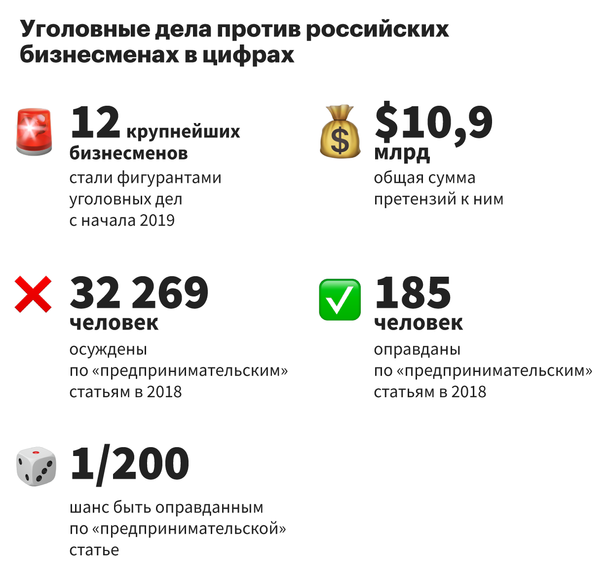 Только за первые семь месяцев 2019 года десяток известных предпринимателей стали фигурантами громких уголовных дел. Их обвиняют в создании преступных сообществ, мошенничестве, отмывании средств и выводе их за рубеж, взяточничестве и растрате — в общей сложности на 700 млрд рублей. Мы выбрали крупнейшие уголовные дела на бизнесменов, составили рейтинг по сумме претензий, а заодно оценили шансы их фигурантов на оправдание — получилось 0,47%. Единственный фигурант рейтинга, которому эта неделя принесла хорошие новости, — это Майкл Калви, дело которого постепенно начинает разваливаться.