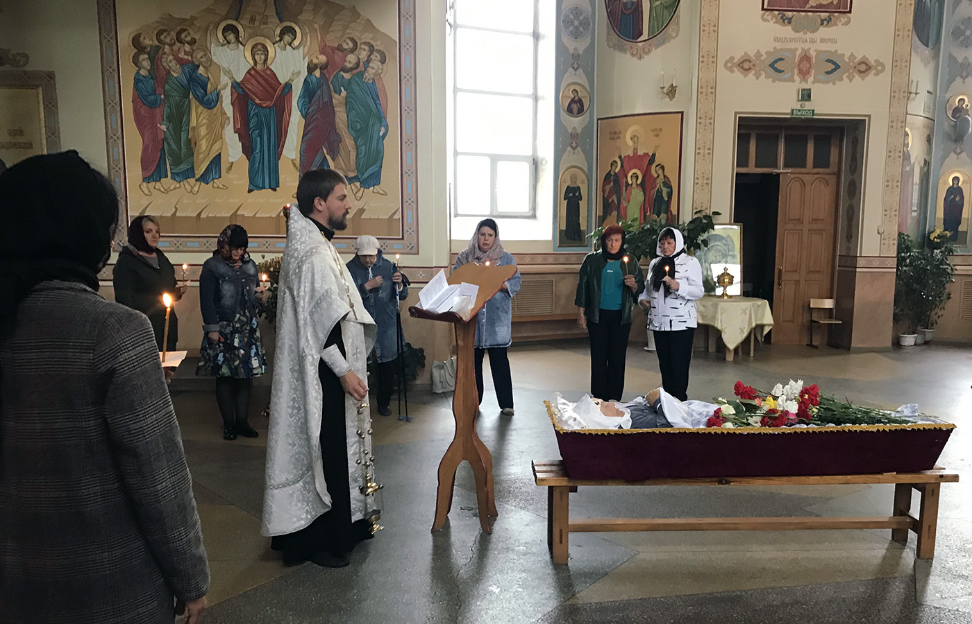 На панихиду в большом теплом храме собирается уже человек тридцать. Громкие всхлипы одной из женщин едва не прерывают богослужение, но она отходит к стене, ей приносят воды и успокаивают, а священник по очередному кругу окутывает гроб дымом ладана.