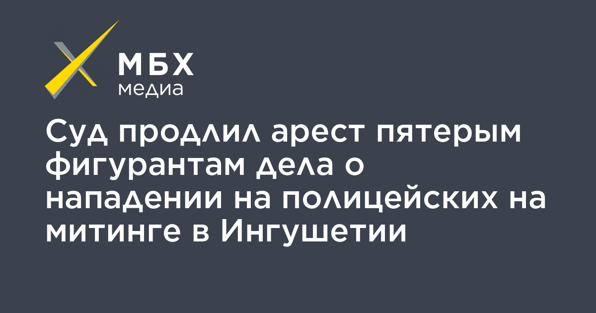 Суд продлил арест до 3 декабря пятерым активистам, обвиняемым в применении насилия к полицейским во время митинга 26 марта в Ингушетии, которые признали свою вину и попросили о суде в особом порядке. Об этом сообщил «МБХ медиа» адвокат Аслан Арчаков.