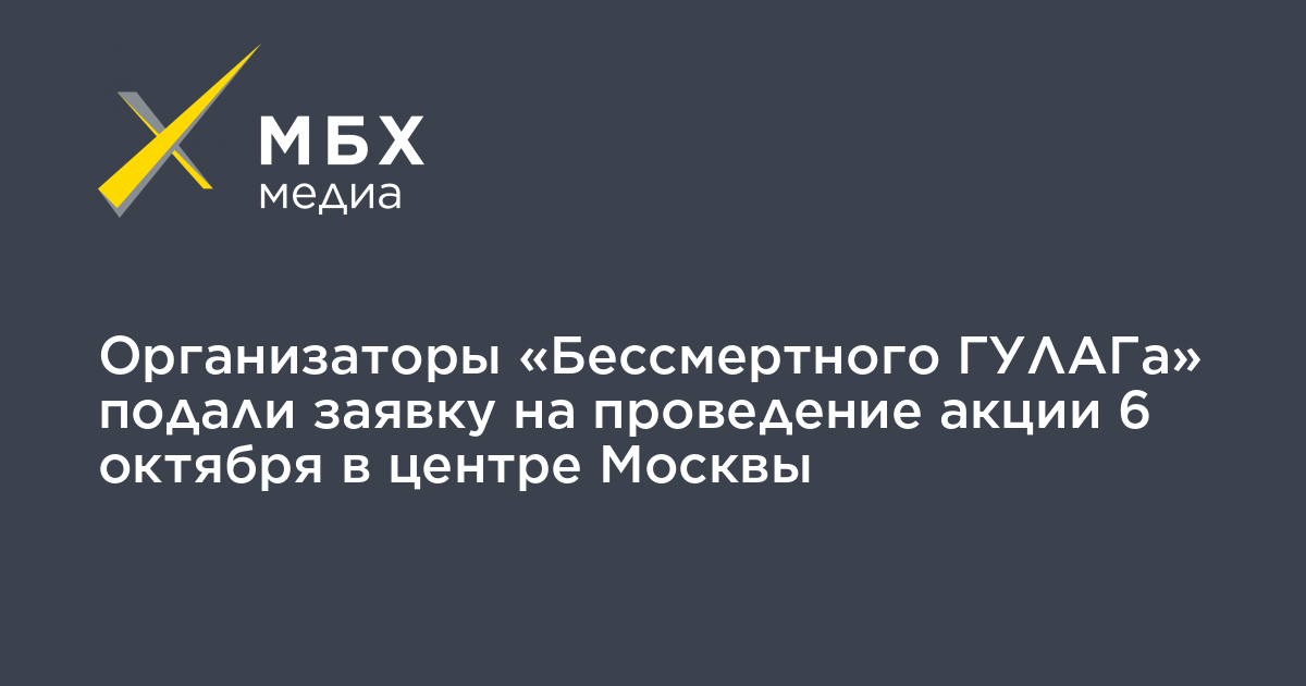 Организаторы акции в память о жертвах коммунистического террора и в поддержку политзаключенных «Бессмертный ГУЛАГ» подали уведомление в мэрию Москвы о проведении акции на проспекте Сахарова 6 октября, об этом «МБХ медиа» сообщил один из заявителей, участник движения «Декоммунизация» Дмитрий Энтео.