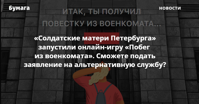 Правозащитная организация «Солдатские матери Санкт-Петербурга» запустила онлайн-игру «Побег из военкомата» о попытке призывника попасть на альтернативную гражданскую службу (АГС). Игроку нужно отвечать на вопросы, выбирать формат документов для того, чтобы его допустили до АГС. Внимание на это обратил ROMB.