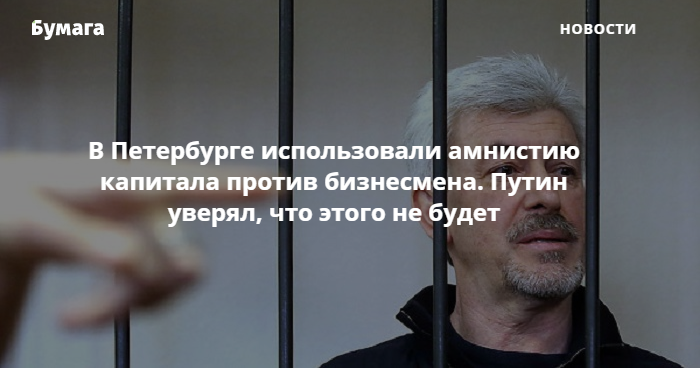 В Петербурге ФСБ использует одну из специальных деклараций об амнистии в качестве доказательства в уголовном деле против совладельца компании «Усть-Луга» Валерия Израйлита. До этого президент России Владимир Путин обещал, что силовики не будут использовать признания «сдающих капиталы» бизнесменов против них. Об этом пишут «Ведомости».