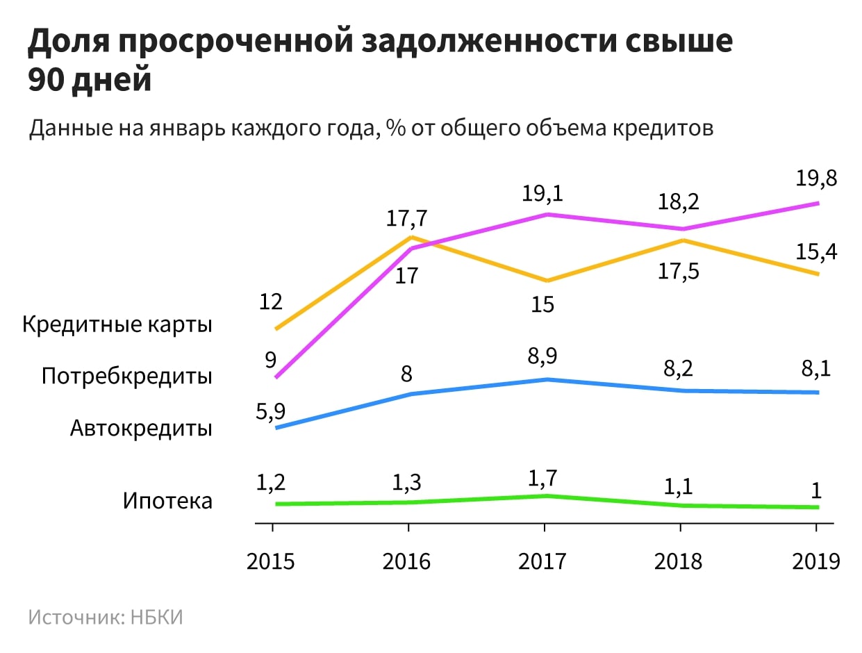 - Но есть и тревожные сигналы. Просроченных кредитов за последние годы стало намного больше. По сравнению с 2014 годом просроченная задолженность по потребкредитам выросла на 140%, по автокредитам и картам — в среднем на 30%. Самый высокий процент просроченной задолженности – по потребкредитам (19,8%). На втором месте – кредитные карты (15,4%). Только по ипотеке «просрочка» падает и составляет всего 1%.
