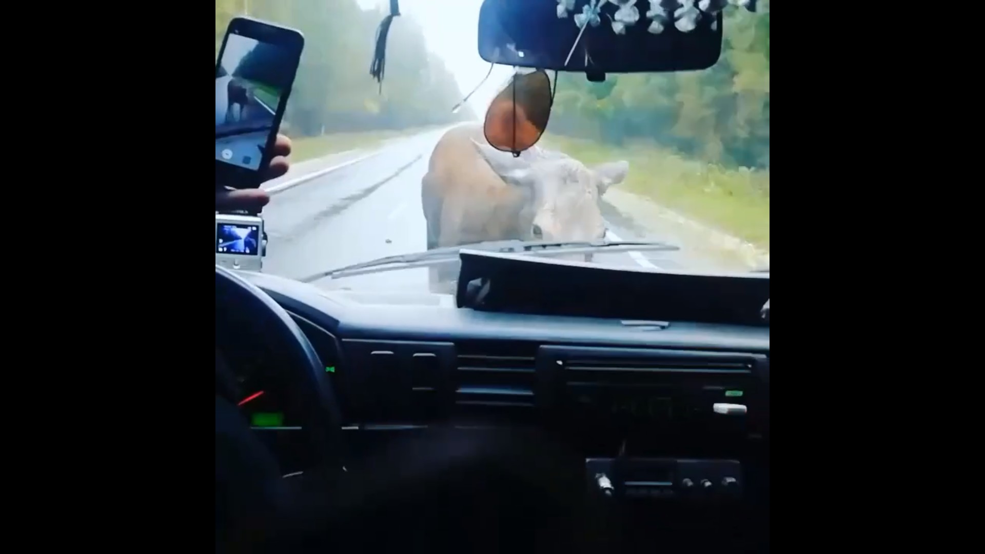Животное миролюбиво подошло к движущемуся автомобилю, преградило ему дорогу и обнюхало транспортное средство.