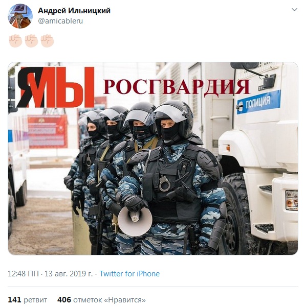 Потом, уже после московских протестных акций, издание «Царьград» выпустило материал о поддержке росгвардейцев, работавших на согласованном митинге 10 августа. В нем рассказали о появившемся в интернете меме «Я/Мы Росгвардия» и назвали его емким выражением солидарности с росгвардейцами. А совсем недавно, во время общественной кампании в защиту Устинова, на «РИА Новости» появился материал «Я/Мы закон», объяснявший, почему правоохранительные органы действовали законно во время задержания актера.