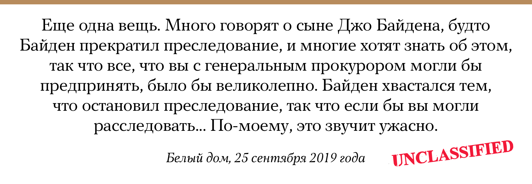 24 сентября спикер Палаты представителей Конгресса, представительница Демократической партии Нэнси Пелоси объявила о начале процедуры импичмента против президента США Дональда Трампа. Причиной стал телефонный разговор Трампа с президентом Украины Владимиром Зеленским 25 июля 2019 года. В ходе него президент США попросил расследовать возможный коррупционный скандал с участием бывшего вице-президента США Джо Байдена. В 2014 году его сын Хантер вошел в совет директоров крупнейшей частной газовой компании Украины Burisma. Расследование против него, по собственным словам, вел тогдашний генпрокурор Виктор Шокин, который был отправлен в отставку по настоянию Байдена.