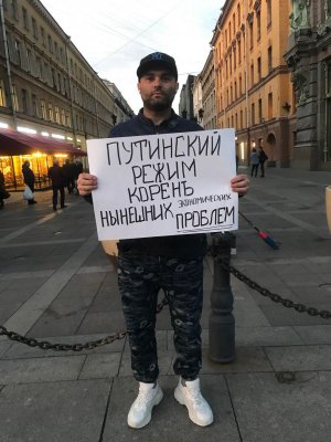 В Петербурге на Малой Садовой улице сторонника «бессрочного протеста» Семёна Ткачука за плакат о «путинском режиме», с которым он стоял в одиночном пикете. Об этом ОВД-Инфо сообщил сам Ткачук.