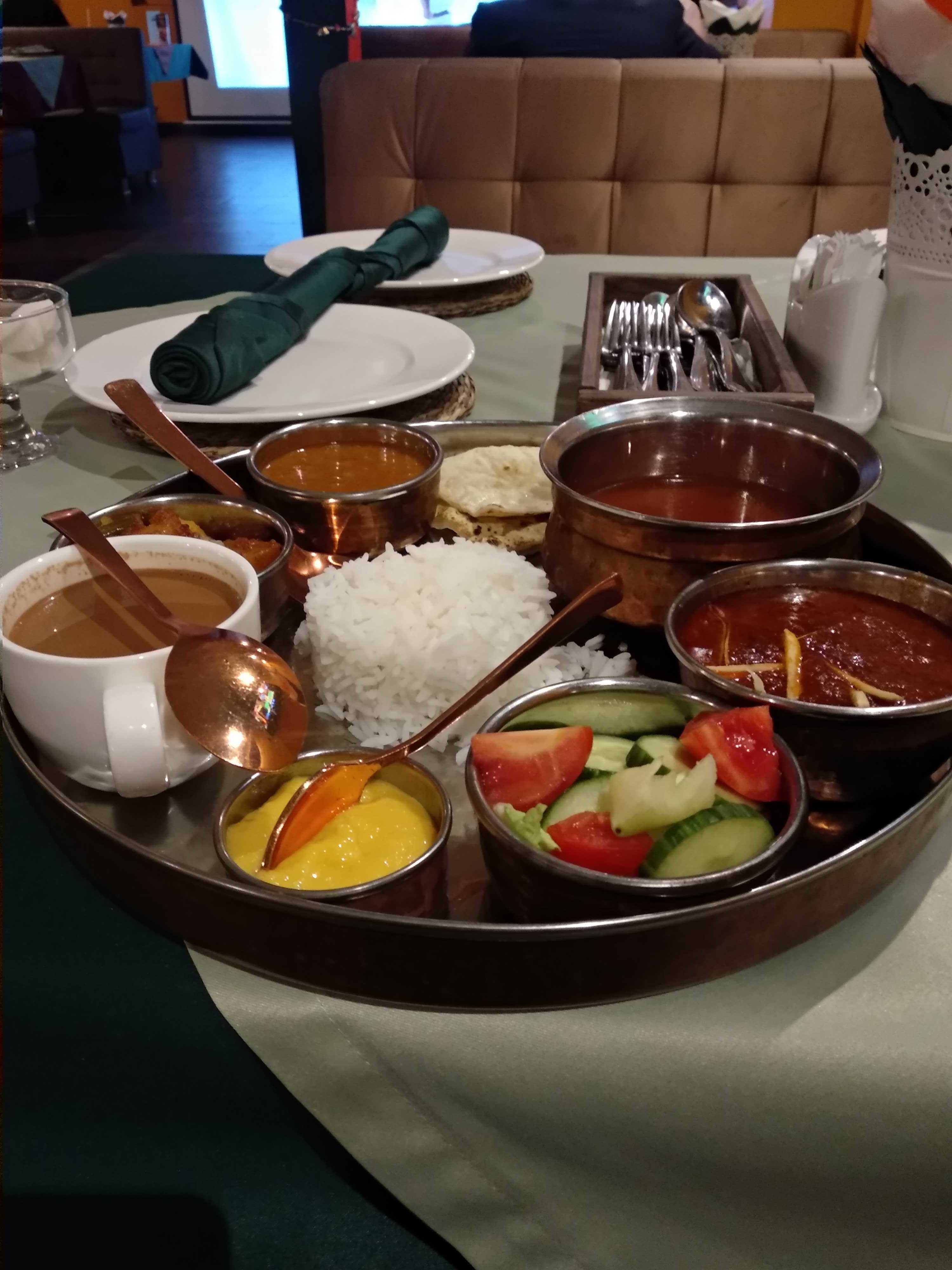 Оно может изрядно отпугнуть вывеской (некрасивая), расположением (неочевидное) и оформлением (готовьтесь к телевизору с бесконечными танцами Митхуна Чакраборти). Зато подают несколько видов бизнес-ланчей, которые серьезно отличаются от привычных: в каждом по пять-шесть блюд, включая десерт.