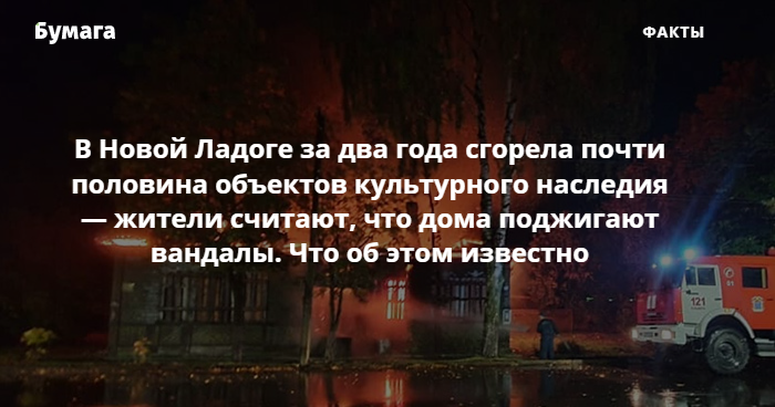 За последние два года в городе Новая Ладога в Ленобласти сгорела почти половина исторических домов, признанных объектами культурного наследия. Два из них — за последний месяц. Местные жители считают, что поджоги устраивают вандалы.