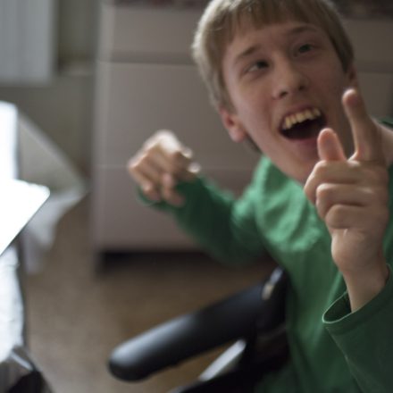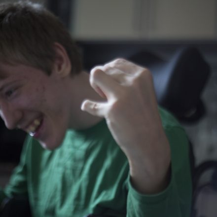 Никита сидит рядом в коляске, разрисованной языками пламени, и с удовольствием жует сырные палочки. Он не отвечает, но выглядит и правда довольным — сейчас он может самостоятельно есть, поддерживать беседу, если она ему интересна, и сам пользуется компьютером. Но так было далеко не всегда.