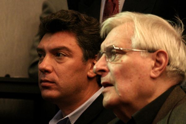 Олег Басилашвили и Борис Немцов на конференции демократических сил в Петербурге 5 апреля 2008 года. Фото А. Карпюк/Грани.Ру