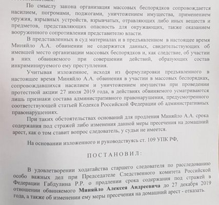 16:12 «В материалах дела не содержится данных, свидетельствующих об имевшей место организации массовых беспорядков и, как следствие, об участии в них обвиняемого», — сказано в решении суда. Нынешнее решение формально не является снятием обвинения с Миняйло, как ошибочно было сказано в новости ранее. В настоящее время Миняйло отправился в Следственный комитет.