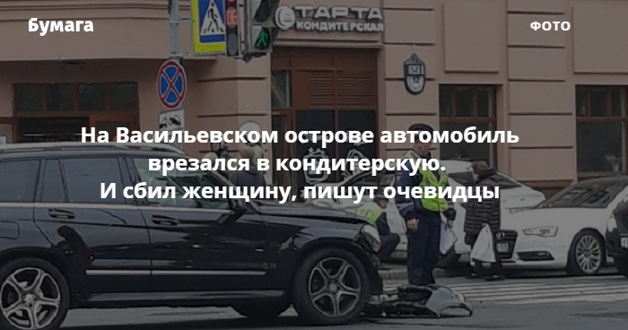Днем 26 сентября на Васильевском острове автомобиль врезался в кондитерскую «Тарта». Как пишут очевидцы в соцсетях, машина также сбила женщину.