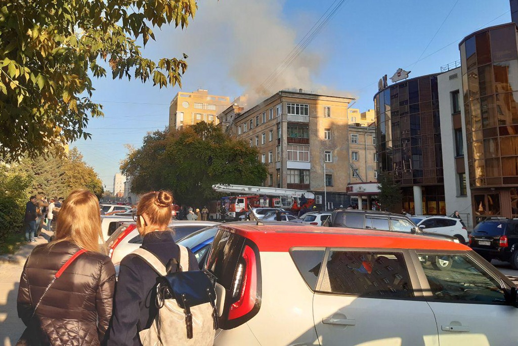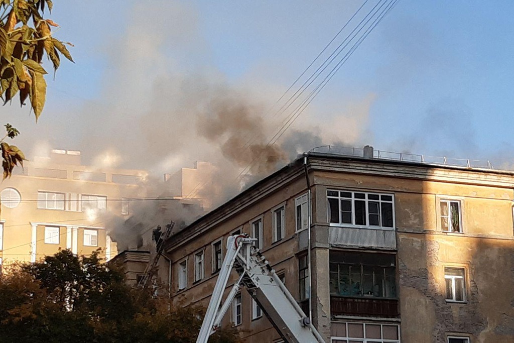 UPD (17:45) Дом напротив (Советская, 8) сгорел в 2008 году, тогда пожар тоже начался с крыши. Здание тушили почти 10 часов. Спустя два года на его месте построили десятиэтажный современный дом с административными помещениями.