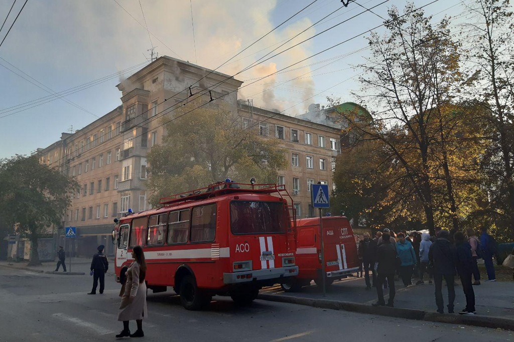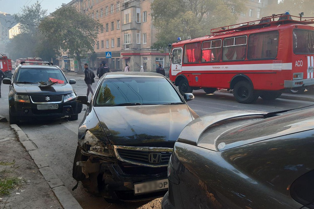 UPD (18:13) На перекрестке возле горящего дома произошло ДТП, передает корреспондент с места событий. Весь квартал заволокло дымом.