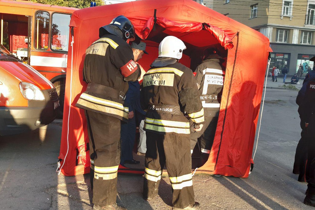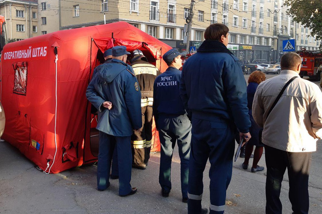 UPD (18:09) Сотрудники МЧС развернули оперативный штаб. Слышно, как по рации сообщается, что первый и второй подъезд дома уже проверены.