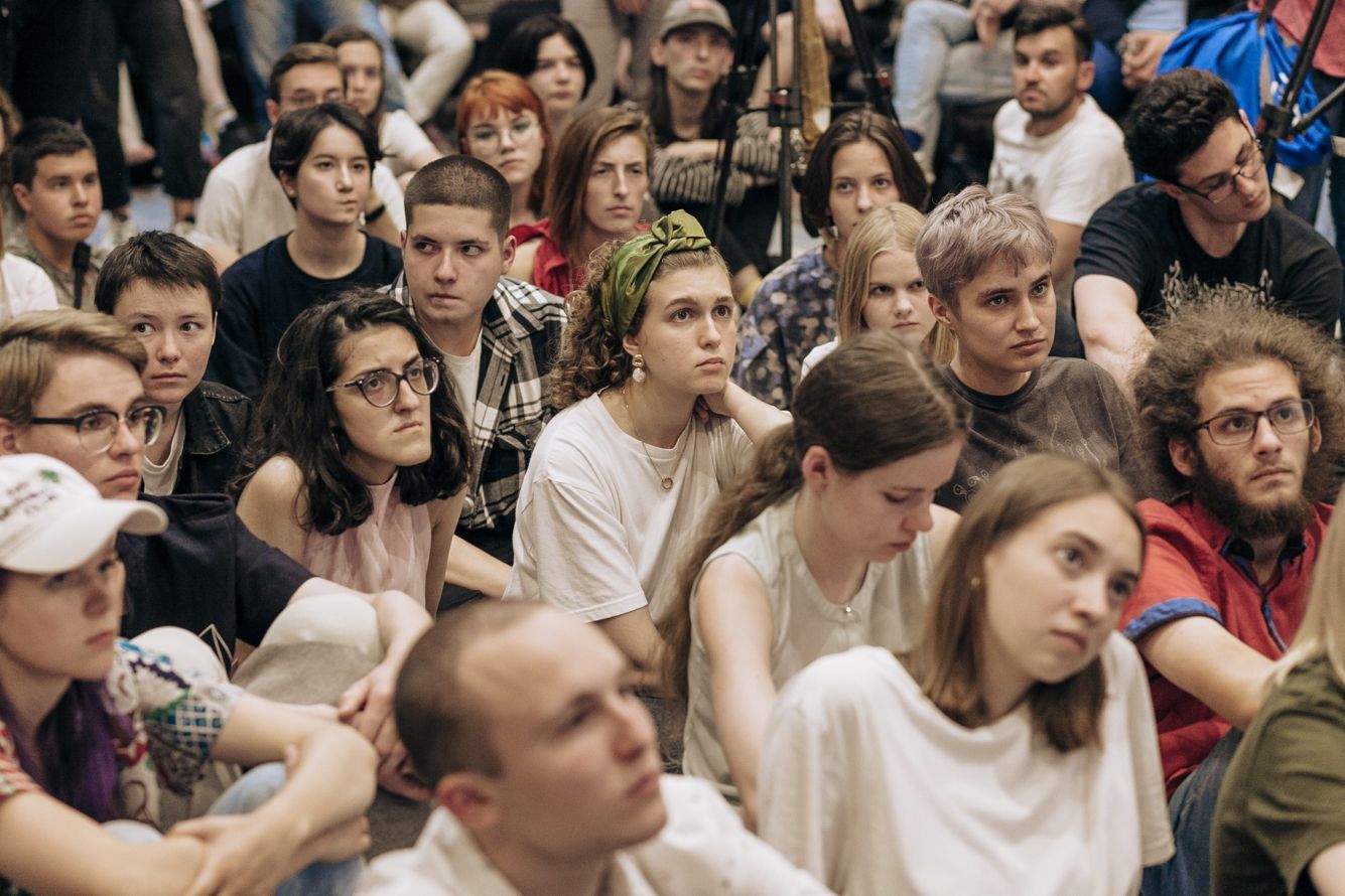 На числе участников все это никак не отразилось. Зал Сахаровского центра — это помещение часто называют ангаром — 30 августа был набит до отказа. Молодые люди — учащиеся самых разных московских вузов — сидели на полу перед импровизированной сценой. У некоторых в руках были листовки с информацией о студентах, арестованных в рамках «московского дела»: их вместе с футболками с надписью «Отпускай» можно было на входе в ангар выменять на донат — пожертвование, размер которого каждый определял сам (вырученные средства организаторы встречи пообещали потратить на поддержку арестованных студентов — организацию передач, покрытие расходов на юридическую помощь).