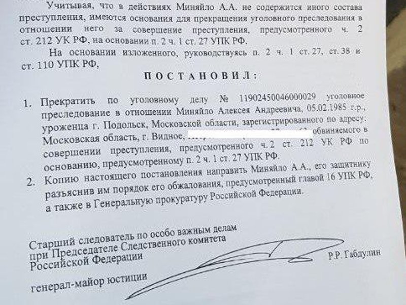 Постановление о прекращении уголовного дела в отношении Алексея Миняйло. Павел Чиков Басманный суд освободил из СИЗО обвиняемого по «московскому делу» Алексея Миняйло. По данным международной правозащитной группы «Агора» из 21 фигуранта под стражей остаются 9. Миняйло был последним обвинявшимся по статье о массовых беспорядках, кто до сих пор оставался под арестом.