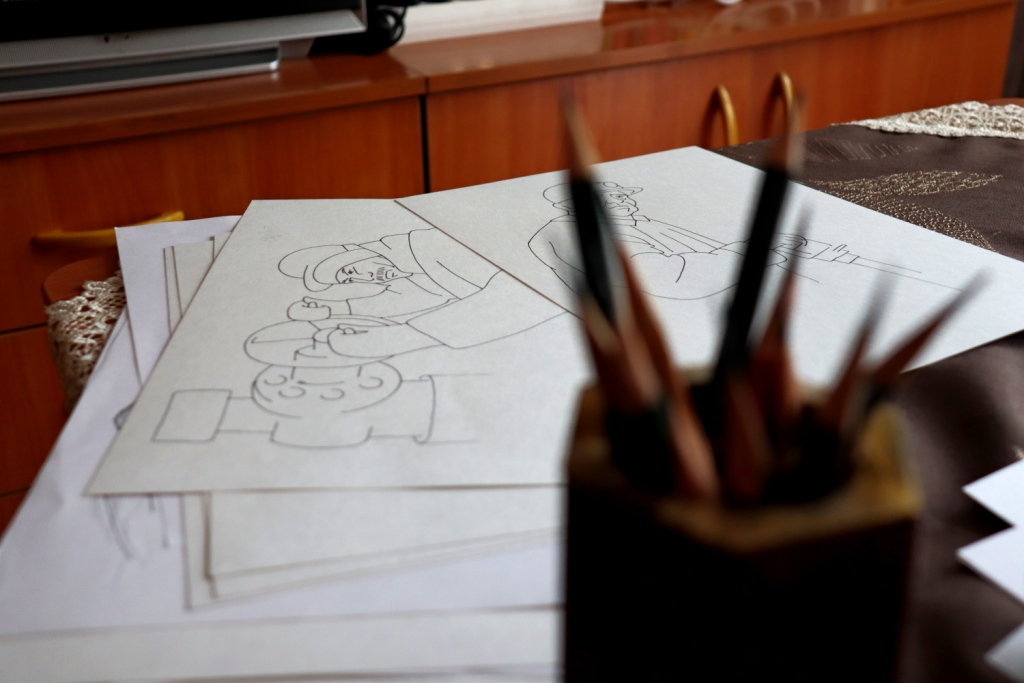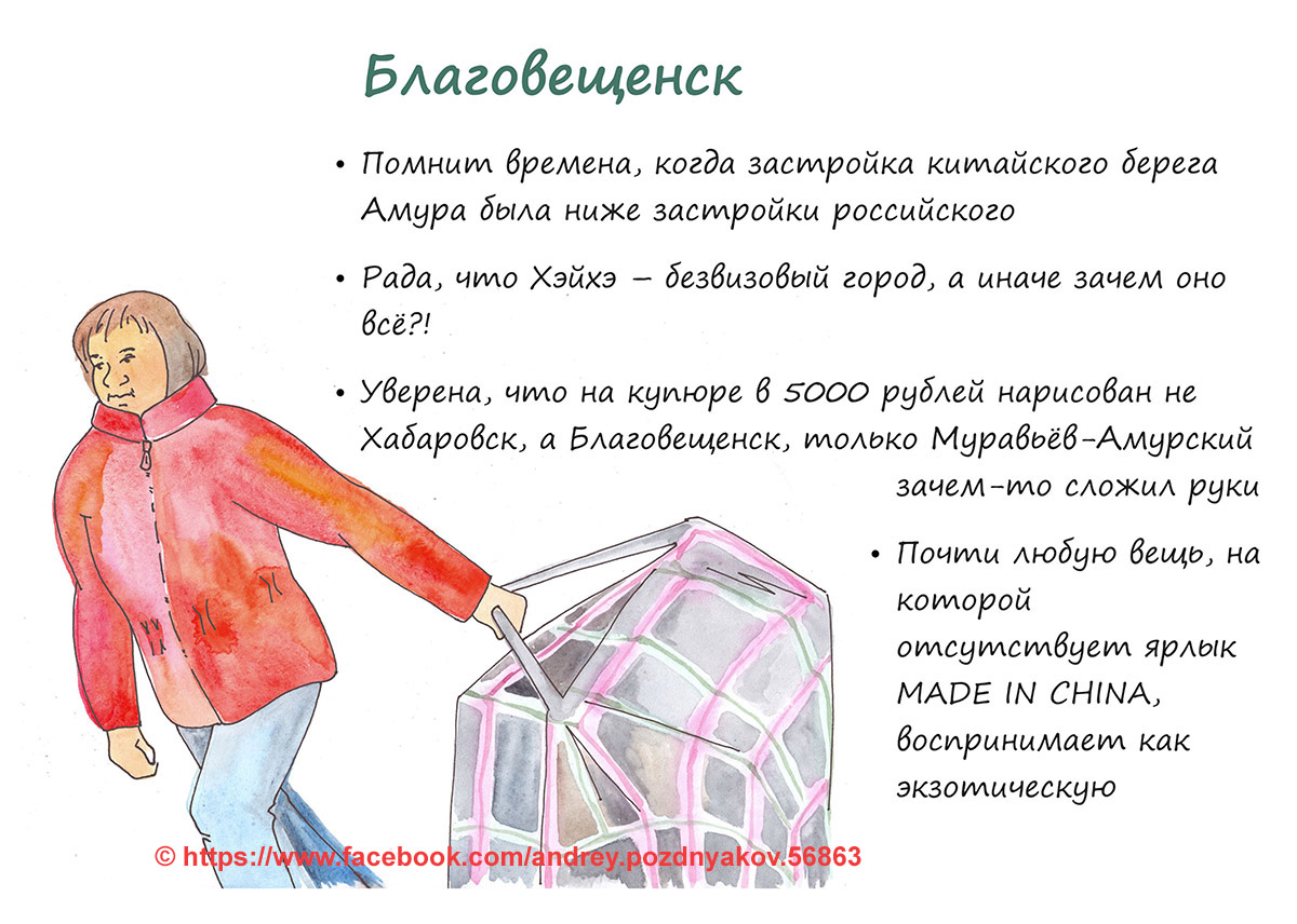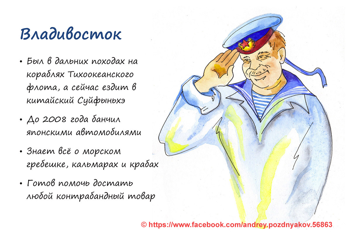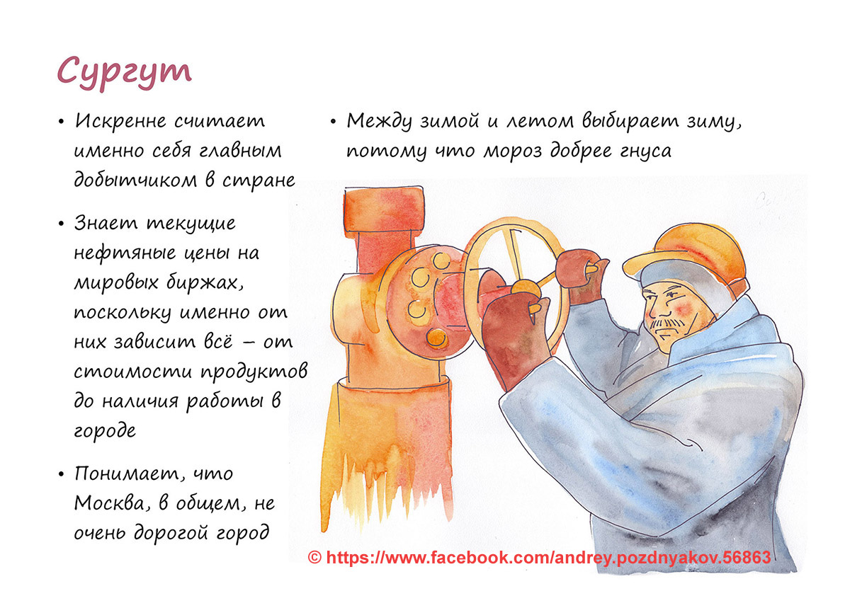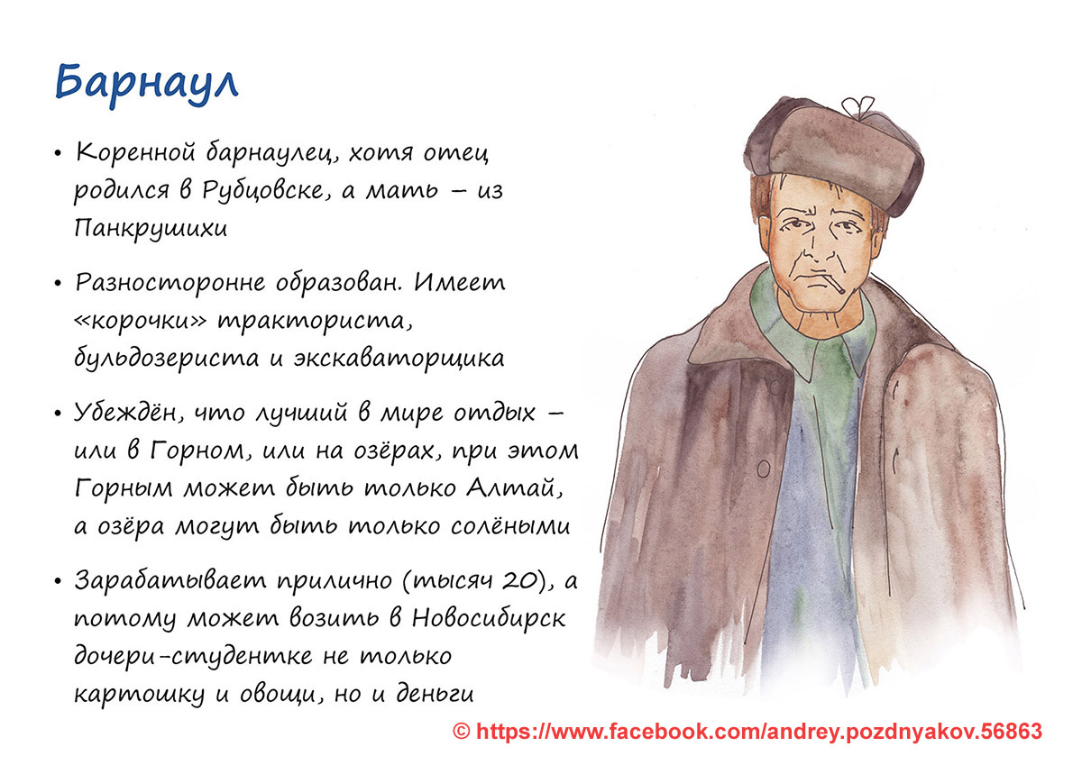 И.П.: Нет, это точно не карикатура. Скорее собирательный портрет. Я ездила несколько меньше, чем Андрей, но достаточно. И постоянно думаю, какие персонажу атрибуты характерные добавить, какое выражение лица, чтобы похож на местного был.