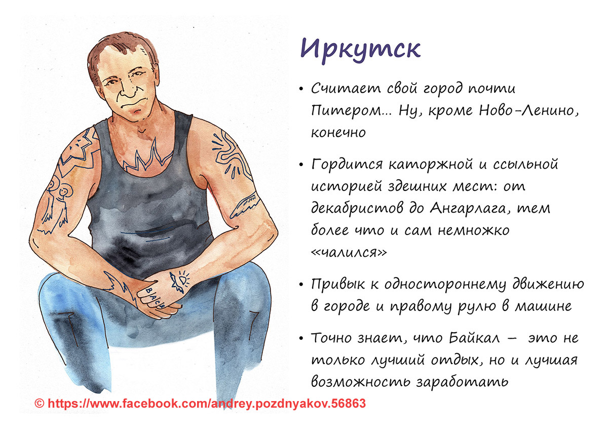 А.П.: Я практически во всех этих городах бывал и неплохо знаю людей оттуда, которые в некотором смысле являются носителями кодов этих городов. И еще из всех поездок привозишь не только фотографии, а какие-то байки, истории, местные словечки. Все это обсуждаем с Ириной, и так рождаются образы. Вот, например, Иркутск. Там университет, наверное, множество образованных людей, это один из самых интеллигентных городов Сибири. Но бросается в глаза и совсем другое: так называемые партаки. Их запредельно много. И это не какие-то красивые рокерские татуировки, а синие солнышки, имена, кольца и так далее. В основном их делают себе люди из Иркутской области: Ангарска, Братска, Усть-Илимска, которые где-то там отсидели, а потом приехали в областной центр жить. И нам захотелось в наших картинках отыграть не образ университетского интеллигента, а вот этих людей с партаками. Изначально у меня родился образ прям такого лютого зэка. Потом я понял, что это слишком грубо, Иркутск – это все-таки не зэковский город. И мы стали смягчать: человек отсидевший, он знает все зоновские понятия, но он не кичится этим, то есть это все-таки не маргинал. Отчасти прототипом можно считать легендарного местного музыканта – я первый раз его увидел году в 2003-м, наверное. Он стоял около местного ЦУМа с электрогитарой, подключился к какому-то простенькому усилителю и пел песни, которых я не знал. И он был весь в наколках, видно, что сидел. А песни-то прикольные! С налетом блатняка, но в принципе, это рок-музыка. А потом мне местные ребята и говорят: так это Серега Хакимов, его все знают. Я его потом в фейсбуке нашел, мы с ним задружились. Вот, пожалуй, очень яркий пример.