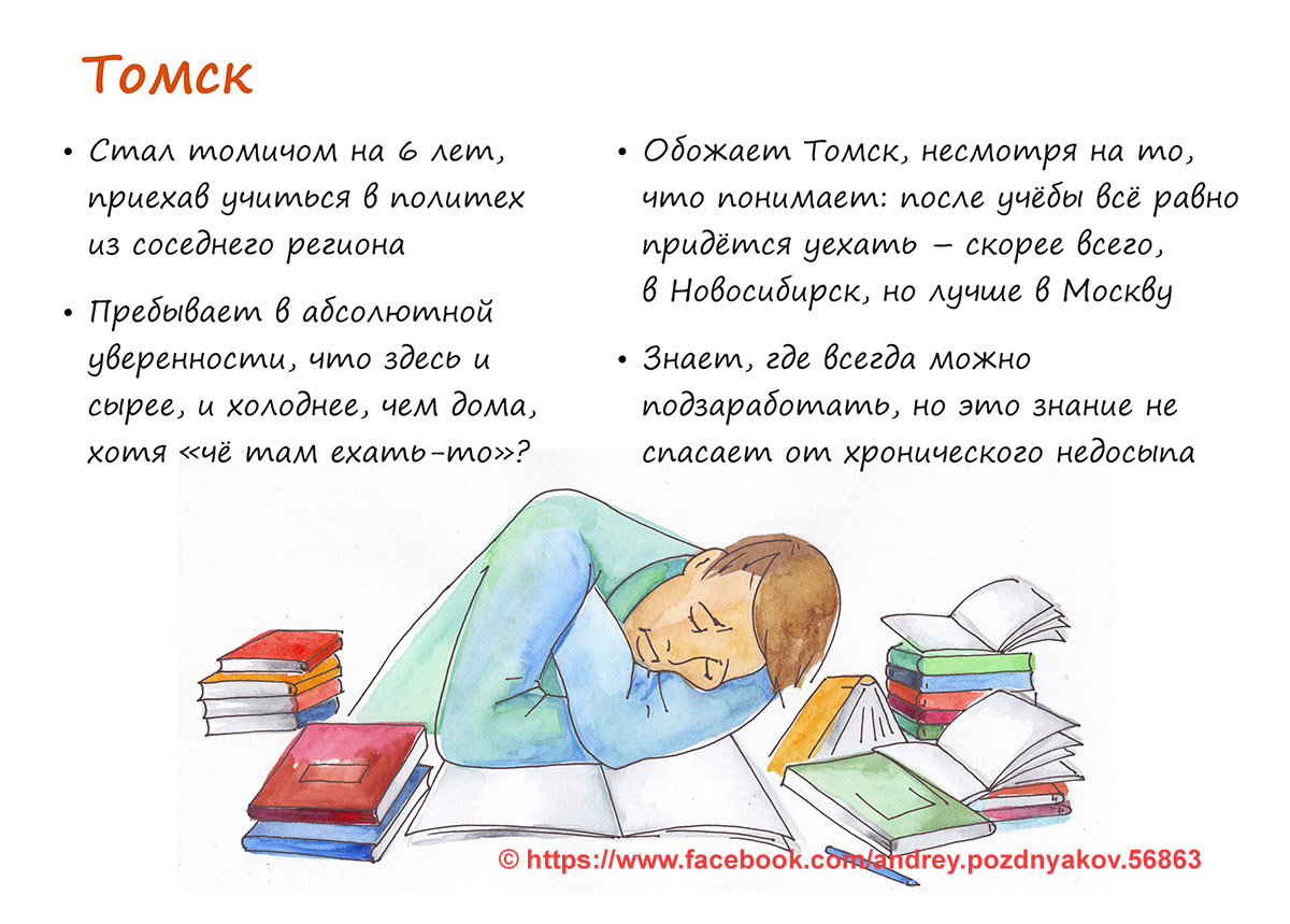 А.П.: Наука на 90% сегодня держится за счет нерасторопных людей и фанатов науки в чистом виде, которые от своих березок никуда. Я сам окончил НГУ и прекрасно представляю ситуацию. И надо понимать, что мы не для новосибирцев эту серию делали, а для всей страны. А для всей страны Академгородок – это бренд номер один, это единственное, что знают про Новосибирск. Или вот, скажем, я не был в Благовещенске, но стереотип, что он существует благодаря соседнему Хейхэ, настолько устойчивый, что, сколько я с благовещенцами общался, это сплошная ориентация на Китай. Поэтому все было легко. Но у меня затык возник даже с теми городами, где я был. Допустим, я обожаю город Омск, но я не очень понимаю типаж. Как ни странно, у меня затык с Красноярском. Понимаю, что это какой-то город с понтами, мажористый, считающий себя столицей Сибири. Но пока я не готов воплотить это в очевидный образ.