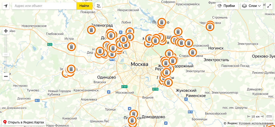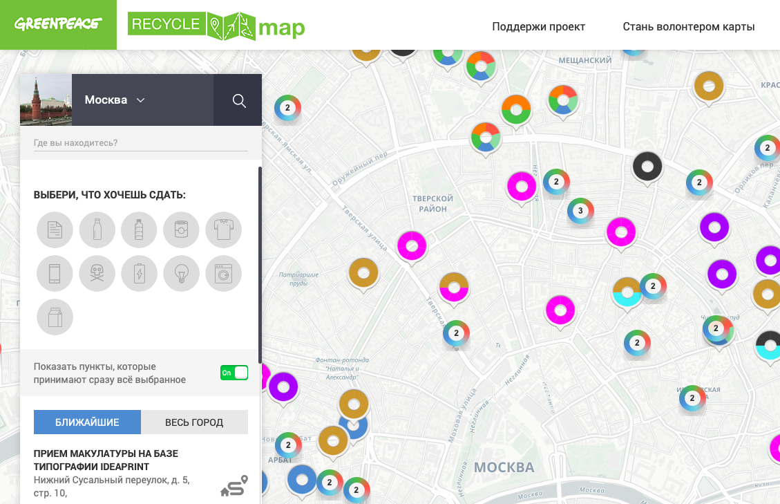 Интерактивная карта от Гринпис России. С ее помощью можно найти ближайшие пункты приема вторсырья и построить до них пеший маршрут. Это краудсорсинговый проект – любой желающий может добавить новую точку на карту, после проверки модератором она появится на карте. С помощью карты жители 69 городов России сдают различные фракции вторсырья на переработку.