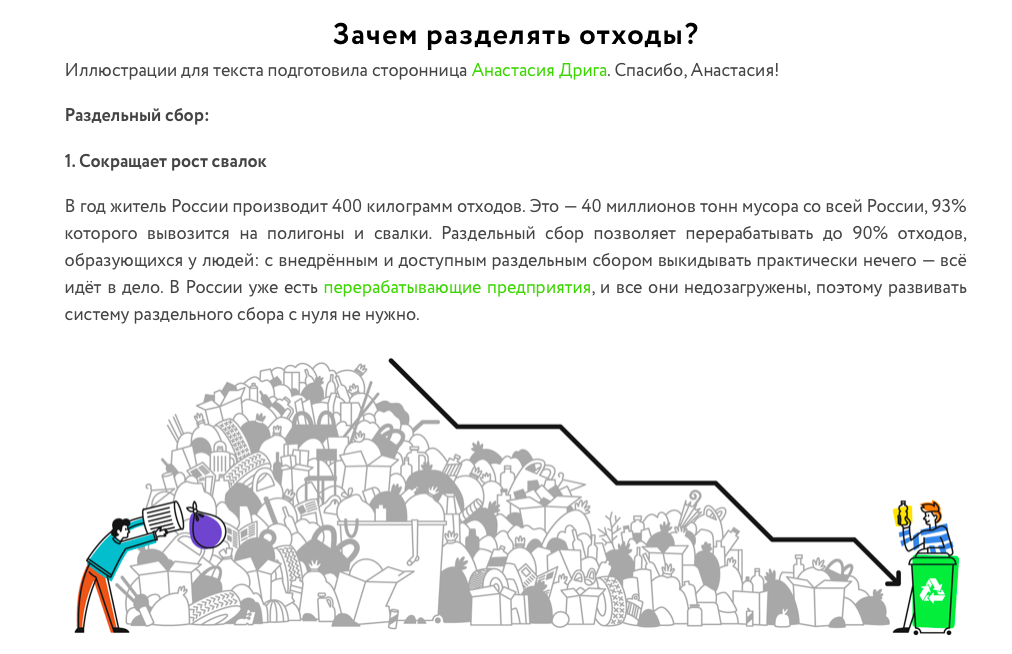 Портал движения «Раздельный сбор». Штабы движения работают в разных городах – найти их можно на сайте. Те, кто пока не планирует становиться волонтером, но уже готовы вести более экологичный образ жизни, могут использовать портал как базу знаний. На сайте есть материалы про сортировку и переработку вторсырья, информация про вред мусоросжигания и словарь основных терминов.