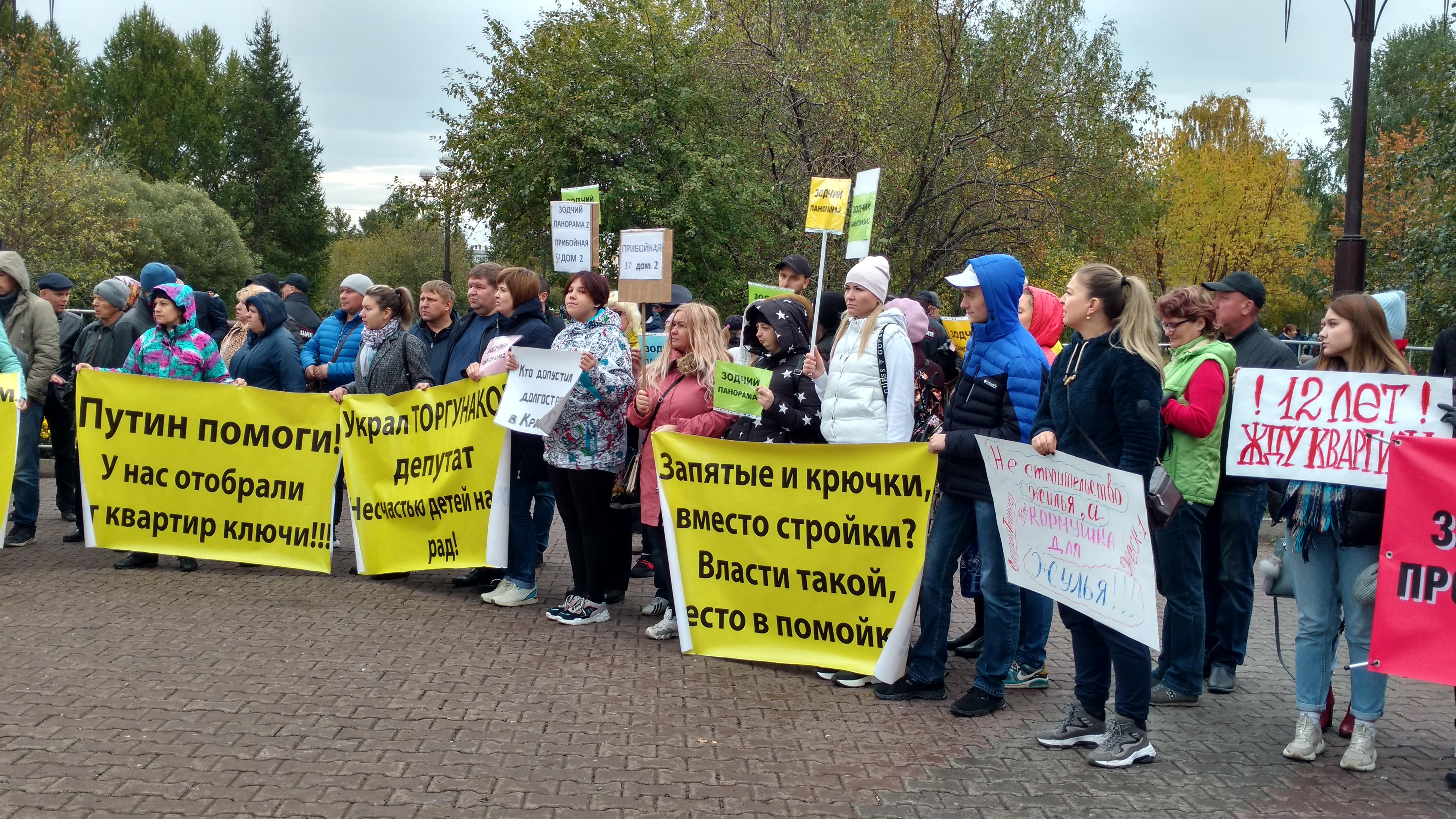 Митингующие скандировали "позор" и "вор должен сидеть в тюрьме". Со сцены читали стихи, написанные обманутыми дольщиками. Неоднократно говорили, что помочь им теперь сможет только президент России Владимир Путин.