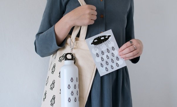 Учитывая любовь к активизму, наш фаворит – набор «Активная гражданская позиция». Он стоит 1000 рублей и состоит из сумки, бутылки для воды и открытки с оригинальным принтом «ГражданЫ» от Славы, особого художника графической мастерской «Простые вещи». Эти невозмутимые господа в котелках стали символом «Простых вещей». Вне зависимости от выбора этого или других вознаграждений все средства от их продажи в проекте пойдут на аренду и ремонт будущего инклюзивного кафе.