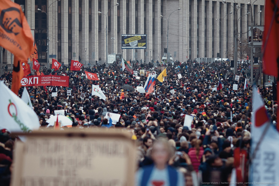 Два часа дня. Не скрывая своего неудовольствия, уставший и мокрый регулировщик пропускает людей через Каланчевскую улицу. Поток поначалу небольшой, в очереди у перехода на Сахарова — максимум человек 100. Среди них, в основном, уже «бывалые» митингующие. Говорят о летних протестах, кто-то даже о событиях на Болотной. Прогнозы, однако, не слишком оптимистичны. В толпе ходят разговоры о том, что из-за плохой, дождливой погоды на проспекте будет не больше 10–15 тысяч. Традиционная процедура досмотра (не особенно пристального), ручейки митингующих стекаются на проспект академика Сахарова.