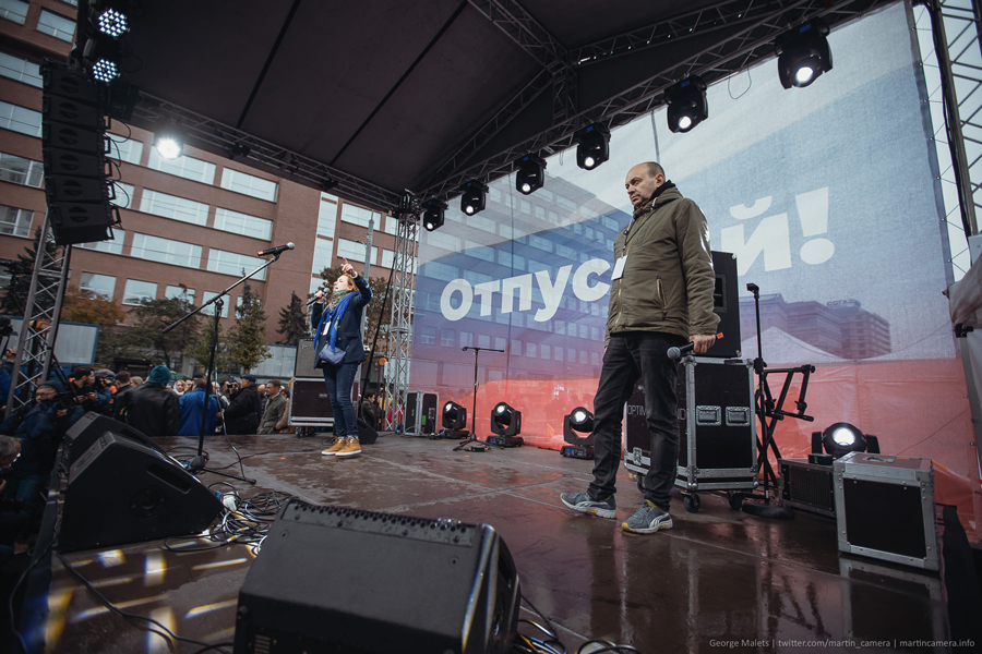 На сцене появляются ведущие — на этот раз журналисты Татьяна Фельгенгауэр (ведущая «Эхо Москвы» и «Дождя») и Сергей Смирнов (главный редактор «Медиазоны»). Они напоминают о главном лозунге митинга — «Отпускай», после чего приглашают на сцену муниципального депутата и незарегистрированного кандидата на выборах Мосгордумы Юлию Галямину. «Свободу всем!» — призывает политик. «Свободу! Свободу!» — отзывается толпа.