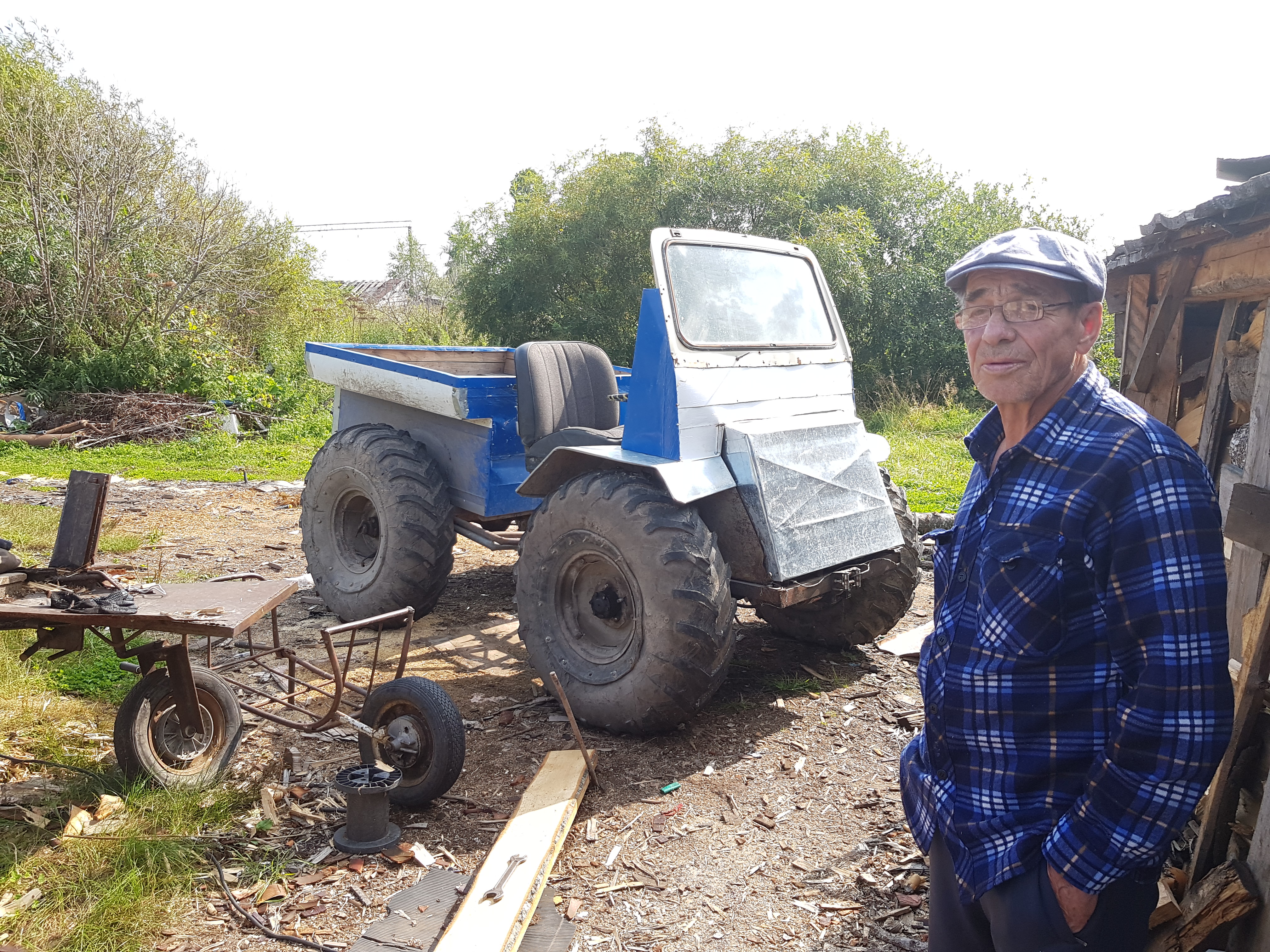 Одна из последних разработок пенсионера – вездеход. Ходовая и мосты от УАЗа, колёса от ЗИЛ-131. Говорит, когда из посёлка в Тайгу срочно нужно – очень выручает.
