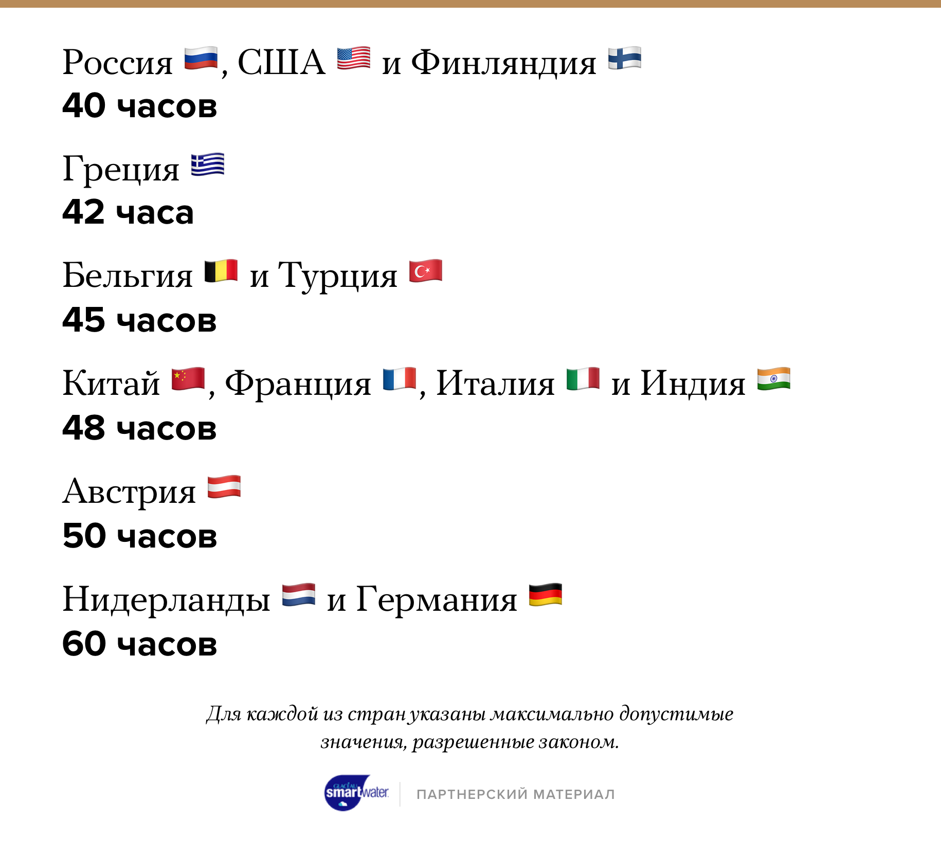 Максимальное число рабочих часов в неделю в разных странах. В одной картинке