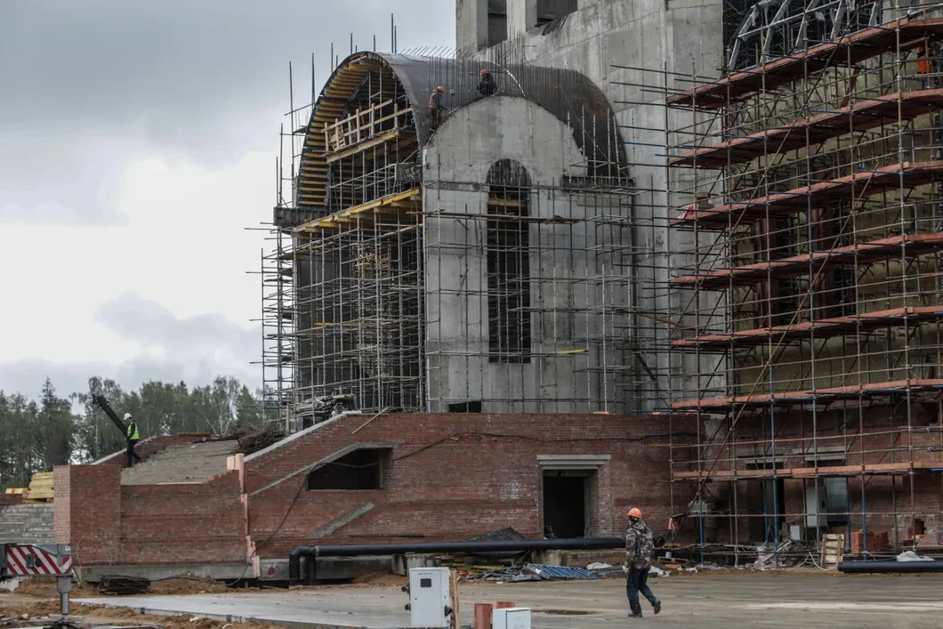 Начиная с КПП в пролеске на Минском шоссе транспорт утопает в грунтовой дороге, потом перебирается на бетонные плиты, снова появляется грунтовка, затем опять плиты. Машина проезжает через лес, вернее, через то, что от него здесь осталось, и оказывается перед парком площадью 26,5 гектара, в самом центре которого уже высится храм Победы. Издалека он кажется даже маленьким, но потом взгляд падает на временные постройки, строительный мусор, грузовики, людей, и становится понятно, что здание просто огромное.