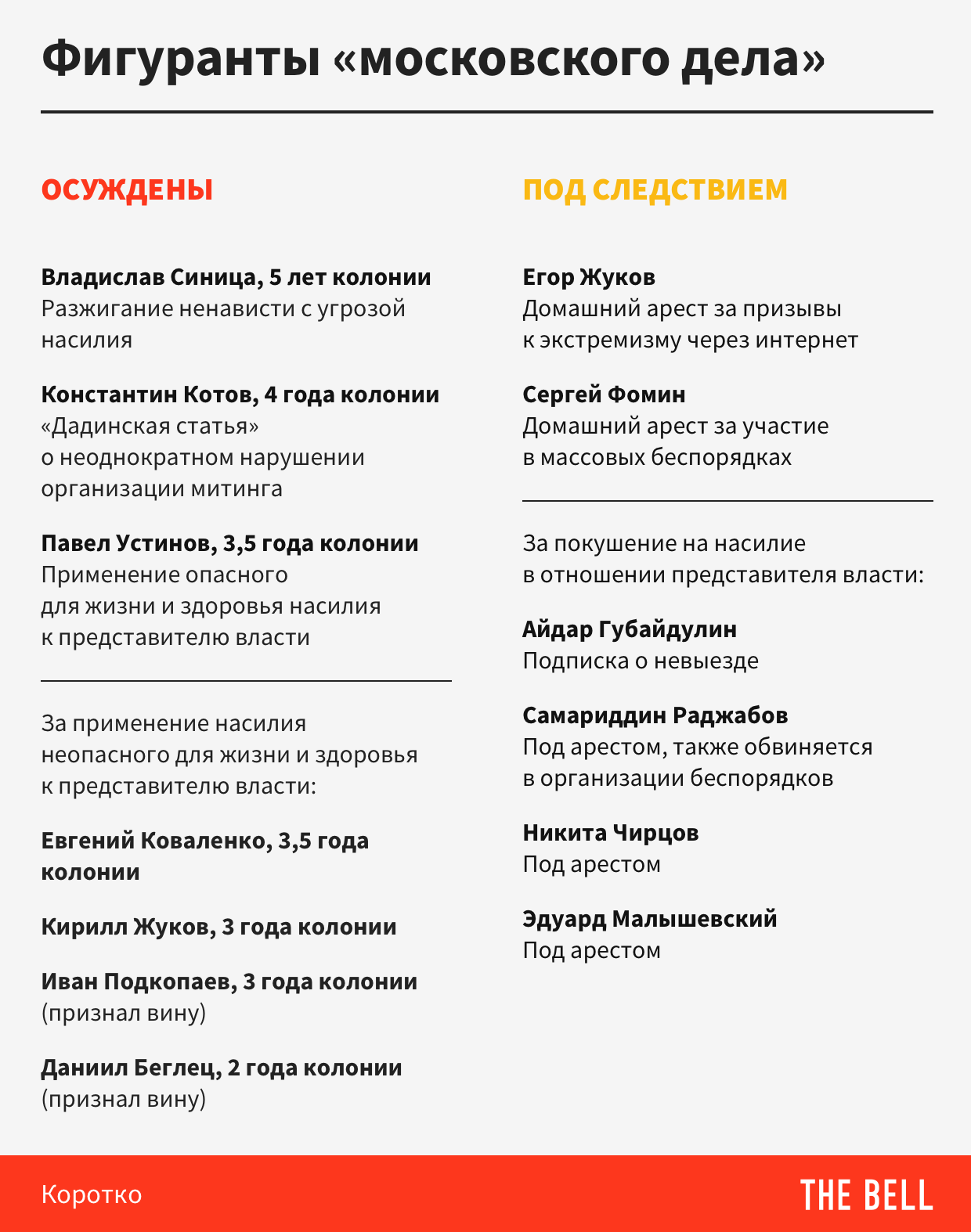 Что дальше. Шансы на освобождение будут не у всех фигурантов «московского дела», говорил «Проекту» кремлевский чиновник — только у тех, у кого есть «такие очевидные доказательства невиновности, как у Устинова». Например, Егора Жукова власти считают настоящим революционером, который якобы проходил обучение организациям беспорядков в Армении.
