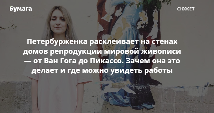 Уже два года графический дизайнер Ульяна Полоз расклеивает во дворах и скверах Петербурга репродукции известных картин — Ван Гога, Пикассо и других художников. По замыслу автора, работы не только украшают стены, но и скрывают трещины.