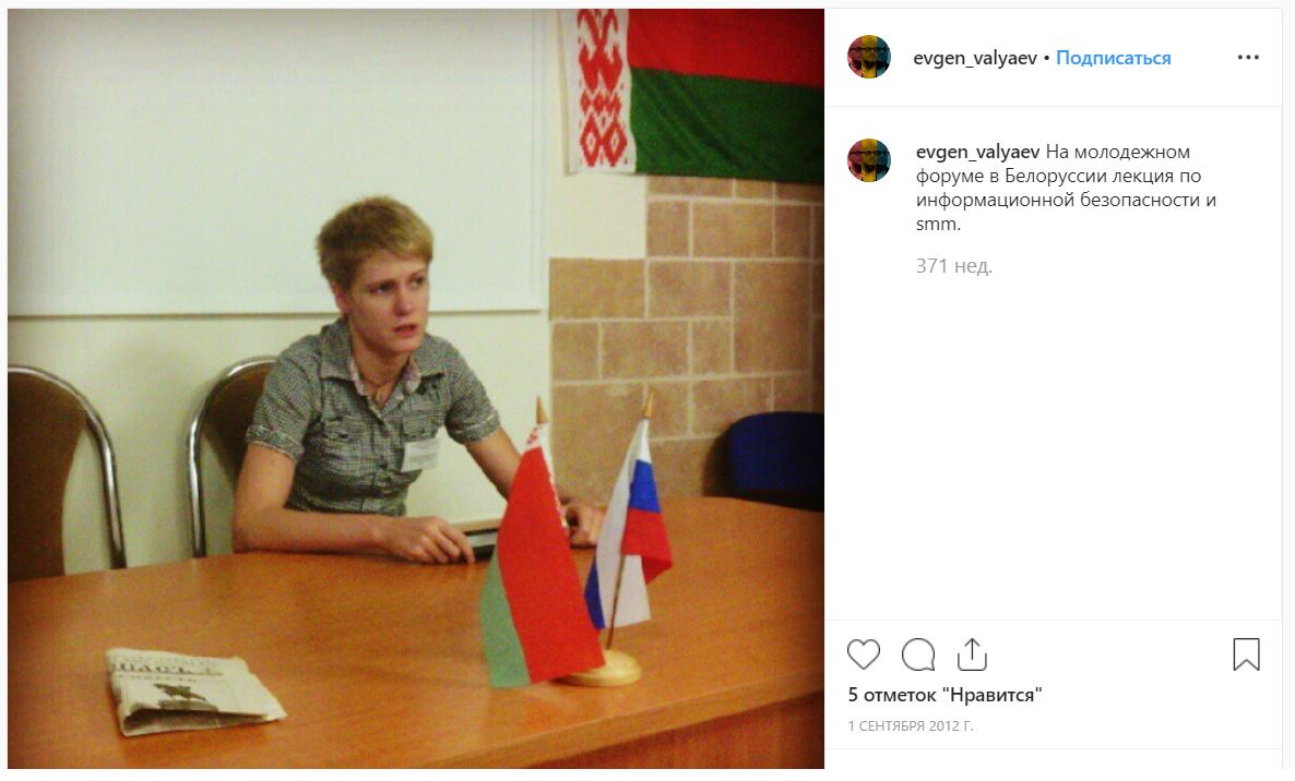 Анна Тригга на молодежном форуме в Белоруссии, 2011 год. Фото из инстаграма Евгения Валяева, бывшего активиста "Русского образа", а ныне – одного из постоянных экспертов РИА ФАН, близкого к Евгению Пригожину. После новостей о задержании Богачевой-Тригги в Минске эта запись была удалена Валяевым.