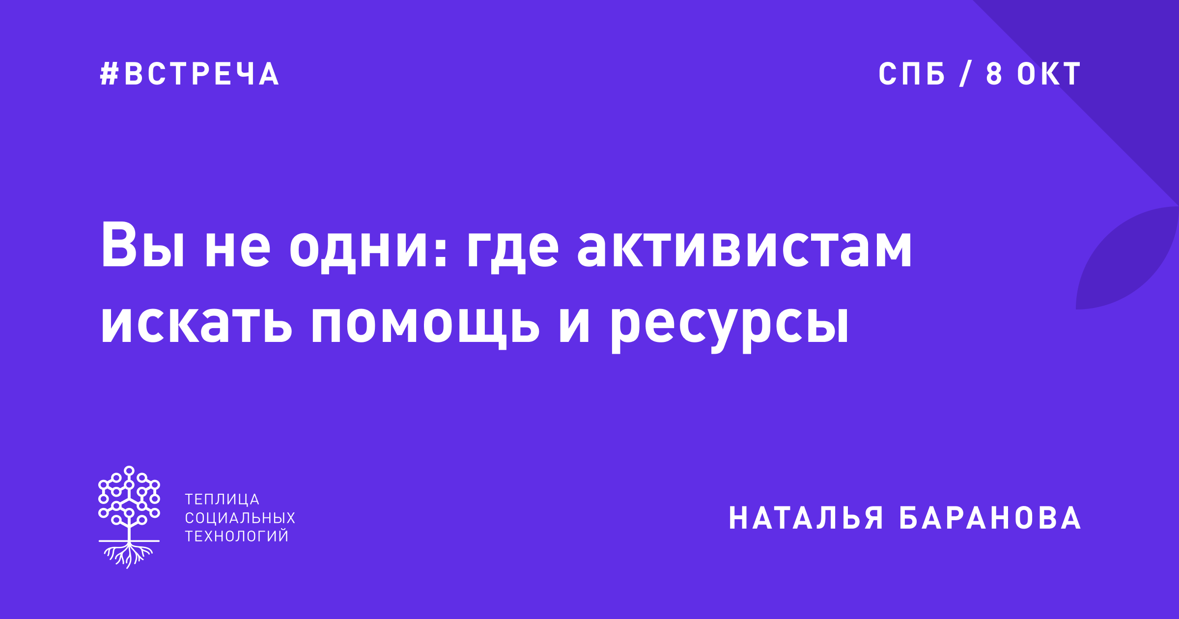 Где активистам и авторам социальных проектов искать ресурсы и поддержку? Какие онлайн-инструменты могут упростить работу, собирать пожертвования, эффективно общаться со своими сторонниками? Какие общественные кампании последних месяцев стали действенными и почему? Узнаете на встрече с главным редактором Теплицы Натальи Барановой в Санкт-Петербурге 8 октября.