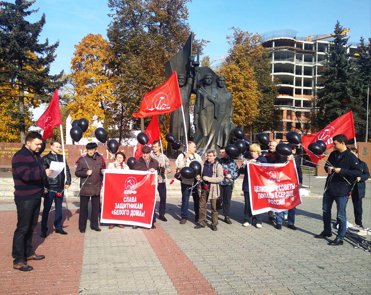 Сегодня на площади Победы актив КПРФ провёл митинг, посвящённый расстрелу Дома Советов в октябре 1993 года. На акцию собрались около 20 человек с плакатами и чёрными шариками.