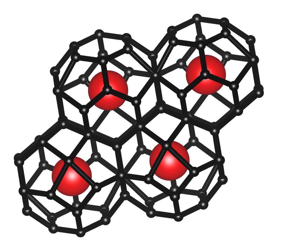 Чтобы прояснить структуру нового вещества, ученые использовали рентгенодифракционный анализ, чувствительный к расположению атомов церия. В кристаллической решетке CeH9 (см. рисунок) каждый из этих атомов окружен своего рода сферической клеткой из 29 атомов водорода. При этом атомы водорода связаны между собой ковалентными связями — как в молекуле газообразного водорода H2, но несколько слабее — а атомы церия занимают предоставленные им полости.